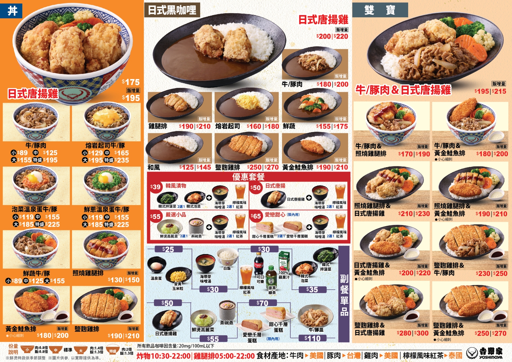 而「日式唐揚雞」系列丼飯,則以外酥內嫩的炸雞搭配一等台灣米香Q白飯。吉野家的「日式唐揚雞」特色為肉質厚實且塊大,去骨雞腿肉佐以加入大量生薑的特製醬汁,經過48小時的醃製使其充分入味,形成吉野家獨有的美味。