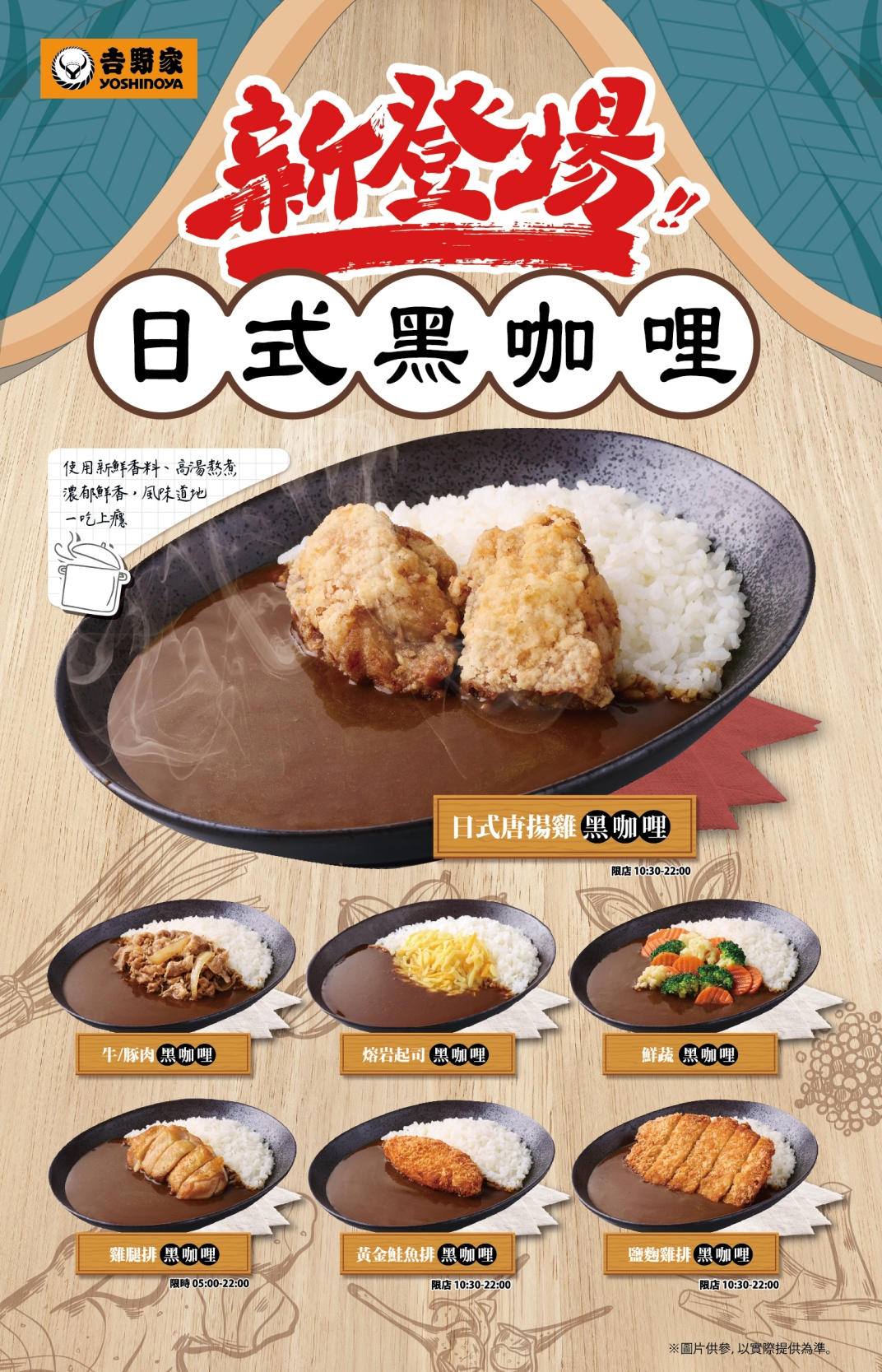 即日起可於全台39間吉野家門市享用到「和風黑咖哩」、「日式唐揚雞黑咖哩」、「牛/豚肉黑咖哩」、「熔岩起司黑咖哩」、「鮮蔬黑咖哩」、「雞腿排黑咖哩」、「黃金鮭魚排黑咖哩」、「鹽麴雞排黑咖哩」等共計9道日本正宗的黑咖哩料理。