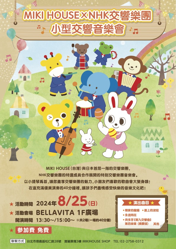 今年寶貝們夏季驚喜還沒結束,在8月25日時MIKI HOUSE與日本首屈一指的NHK交響樂團的特選成員合作展開的特别交響樂團音樂會將在BELLAVITA一樓廣場登場喔!