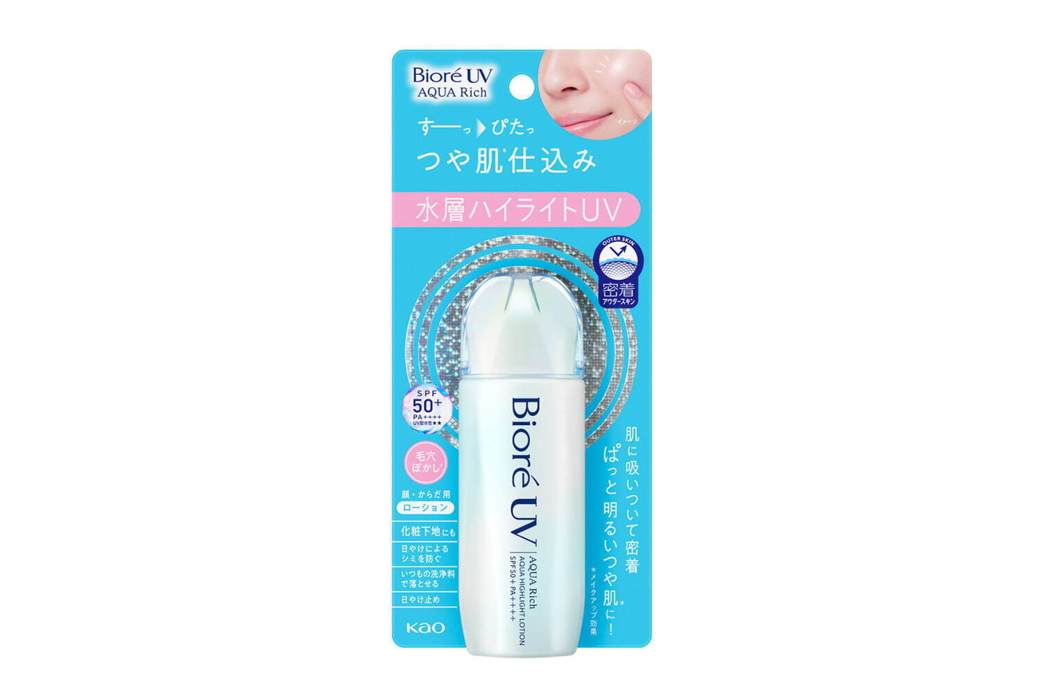 花王的「Biore UV Aqua Rich」系列推出了新產品「水潤提亮防曬乳(Biore UV Aqua Rich Aqua Highlight Lotion)」,這款多功能防曬乳液不僅能提供自然的頰骨、鼻梁、額頭打亮效果,將整張臉的膚色提亮,還能作為妝前底霜使用,遮蓋毛孔和凹凸不平的肌膚。雖然有高效防曬效果,但用肥皂輕鬆洗淨,而且價格親民,是CP值極高的一款防曬產品。