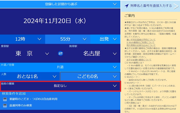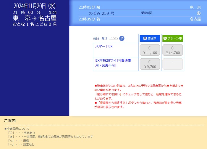 在車次頁面也會顯示早鳥優惠的「割引」,選擇你要的車次進入後就可以選擇一般座位或是綠色車廂,同時也會跳出一般價格和早鳥價格,就可以進行預訂囉!
