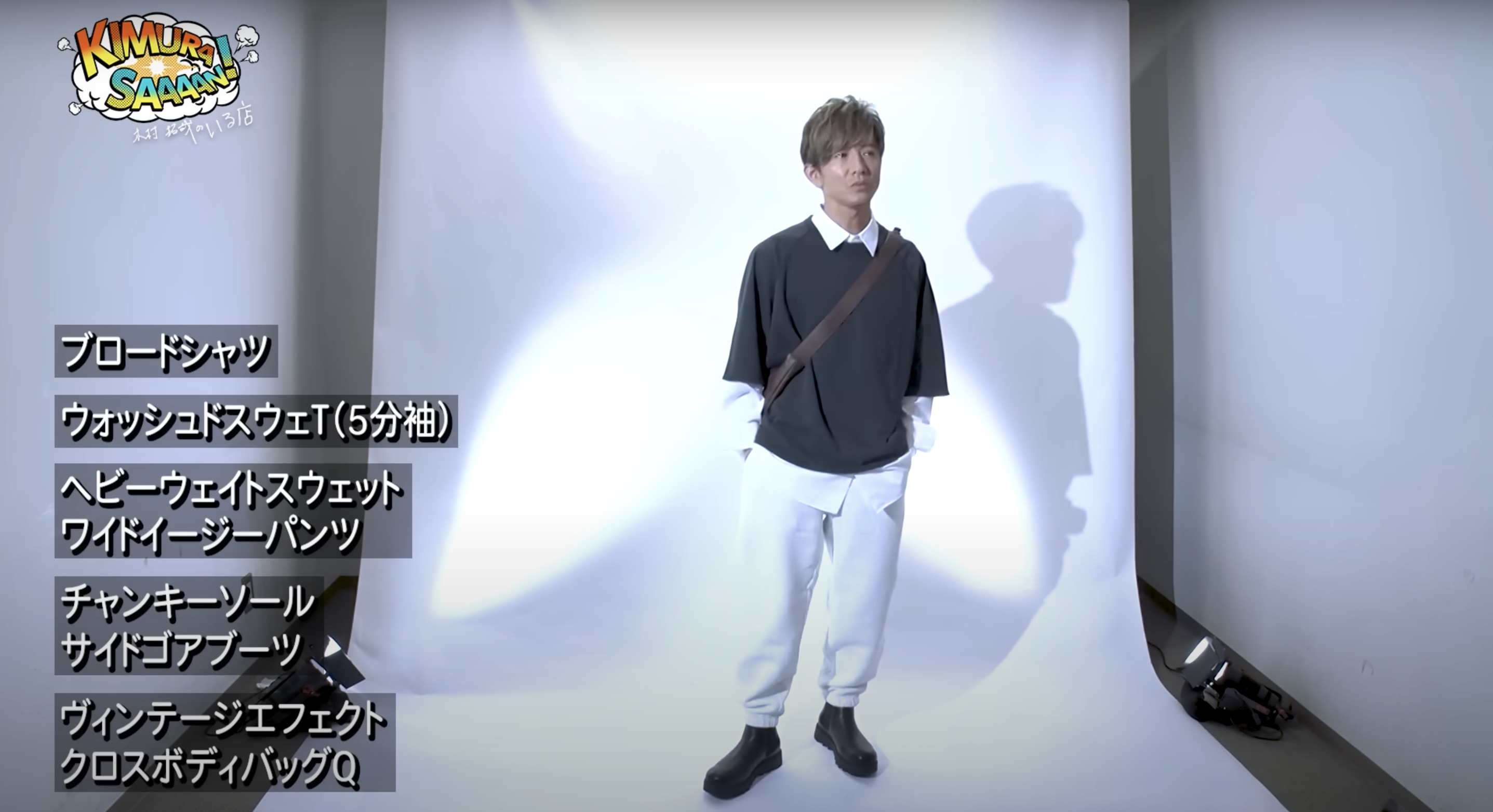 第一套木村拓哉以 GU 的五分袖休閒風T恤、easy care府綢襯衫、Heavy Weight重磅內刷毛休閒寬版輕便褲為搭配,如果單穿 TEE 加長褲,可能造型度略顯不足,所以特地內搭一件白襯衫,讓整體風格突顯重點又顯層次,再混合厚底側邊彈性靴,讓看似休閒風的裝扮,多增一點個性小細節,側背仿舊斜背包運用暗色系營造低調質感,簡單又不燒腦的衣著方式,讓禮拜一穿搭充滿質感氣息。