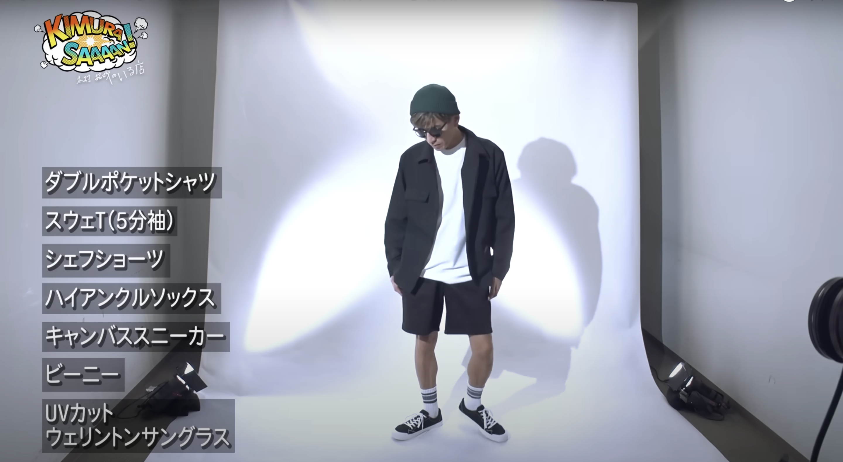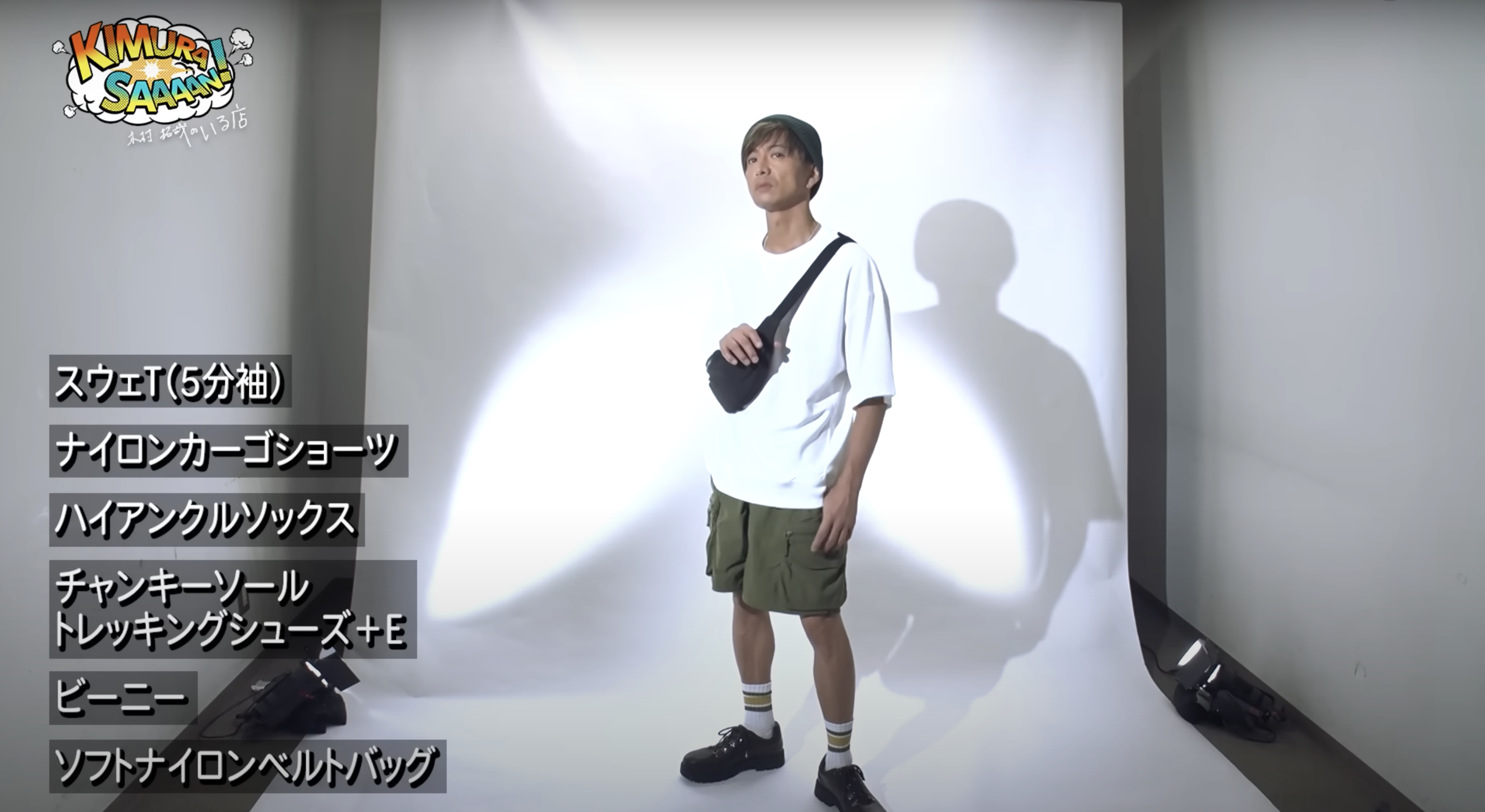 第二套木村拓哉同樣選擇同件五分袖休閒風T恤,百搭的白 TEE 真的穿一週都不嫌膩,價格也非常平價,不僅可以包款包色也不傷荷包,下身選擇橄欖綠的尼龍工作短褲,大口袋設計的工裝設計,可說是今年非常主流的單品,防撕裂材質不管休閒或運動穿都很合適,木村拓哉說:「五分短褲搭配尺寸稍大短 T ,再結合綠色針織針織帽,能調整穿搭的和諧度,再刻意加上皮革鞋,讓細節瞬間擁有加分效果」。