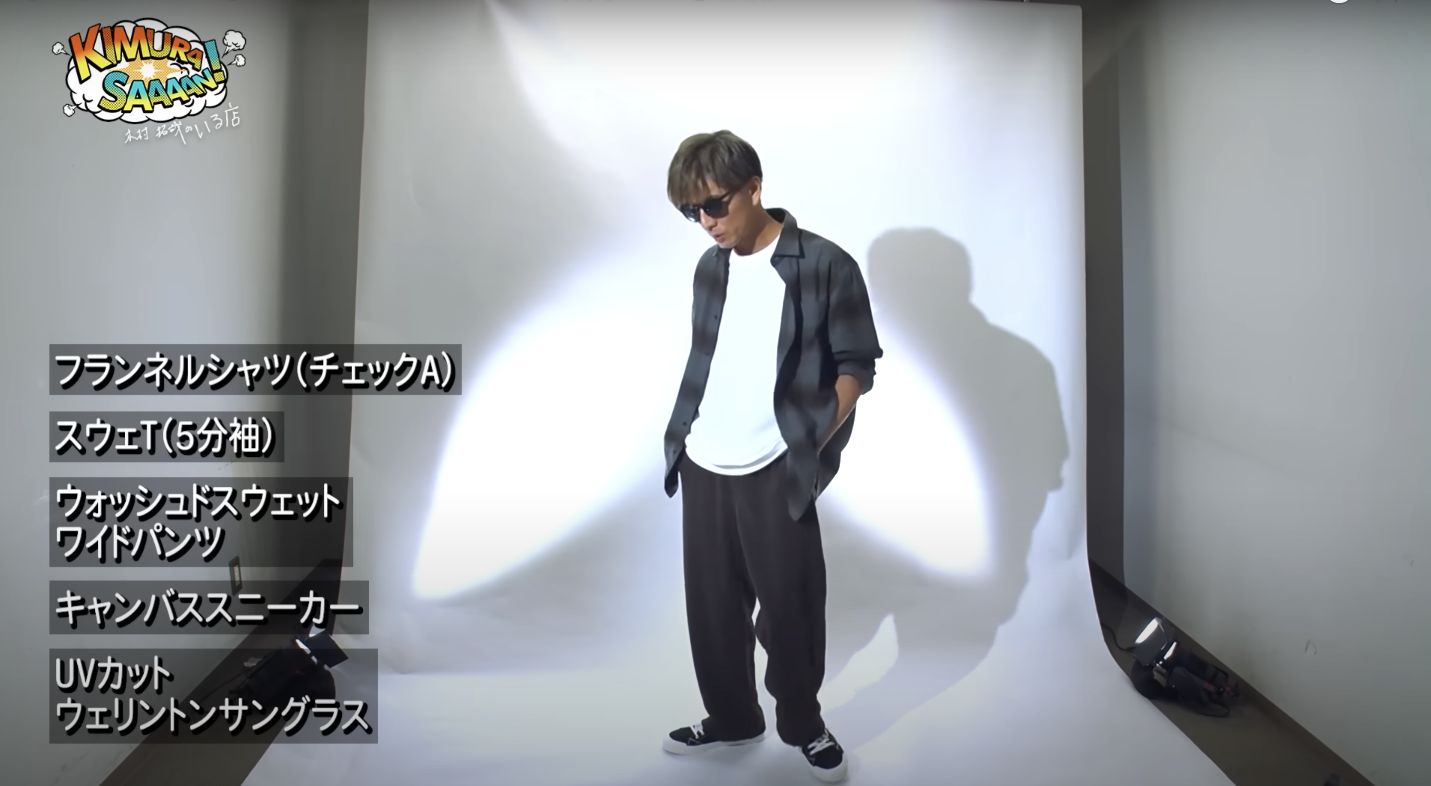 木村拓哉第三套再次選擇「五分袖休閒風T恤」外搭「法蘭絨襯衫」,這兩款都屬於男女適穿的單品,褲子混搭深咖啡色「水洗休閒寬褲」,看起來率性簡單十足,襯衫 + TEE 完全不挑身形,好駕馭舒適度也高,穿起來很輕鬆適合小週末穿著,佩戴太陽眼鏡還有種收斂的時髦。
