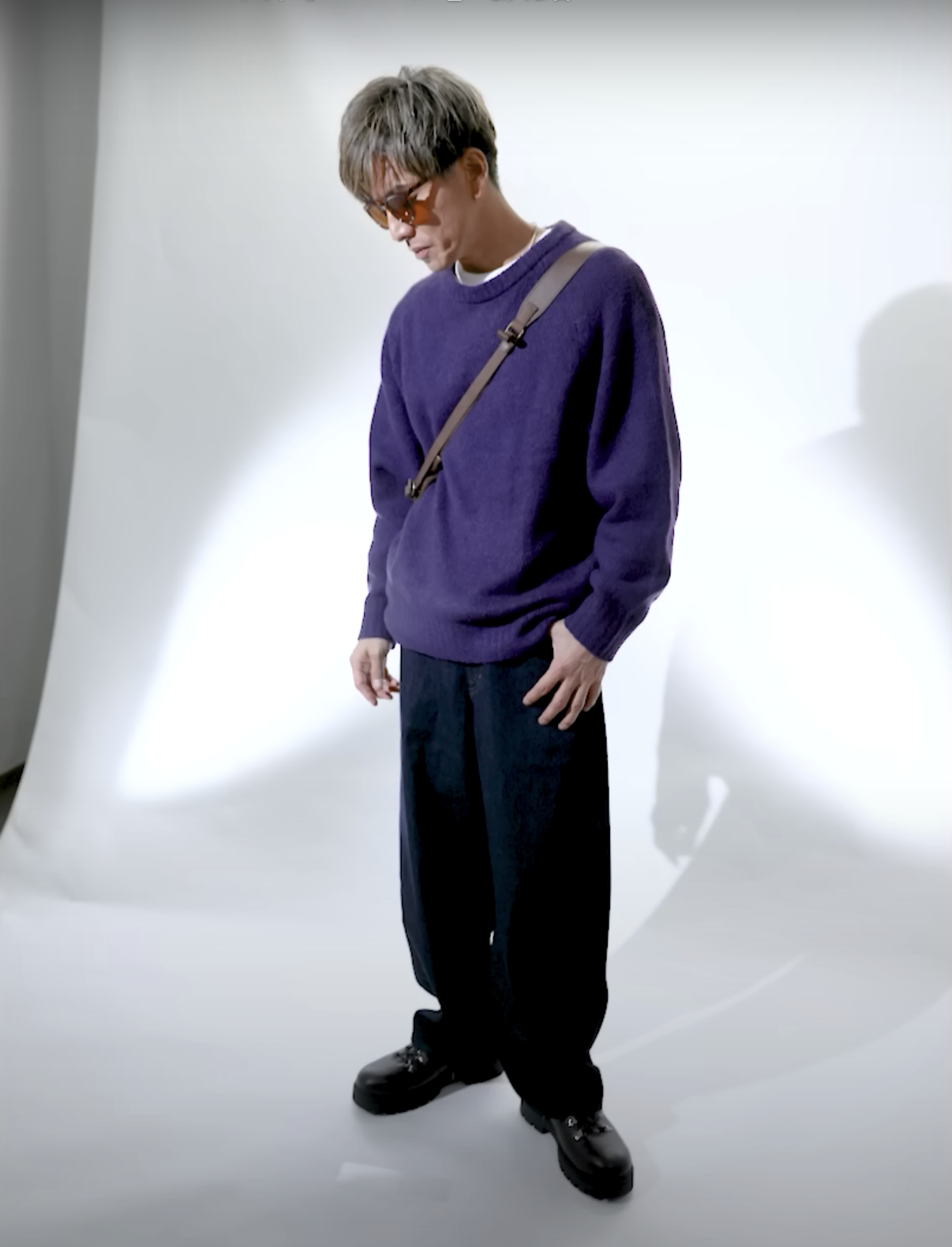 為禮拜四造型的第四套搭配,木村拓哉上身選擇紫色BRUSHY KNITTED 針織圓領休閒上衣,同樣為男女適穿版型,真的很適合男女朋友一起買,可以交換穿也可以穿出情侶裝,針織同時保暖又能增加柔和質感,立即便能連結高級印象,下身穿上黑色barrel leg錐形牛仔褲,這系列一直是 GU 熱賣的高人氣單品,黑 + 紫很顯街頭潮流感,推薦一起嘗試看看這樣的配色,木村拓哉也說:選用牛仔褲為穿搭主角,上身是紫色的針織上衣,再內搭白色T恤,展現俐落層次造型,然後再故意把白 TEE 領口拉鬆,是製造細節層次的小心機」。