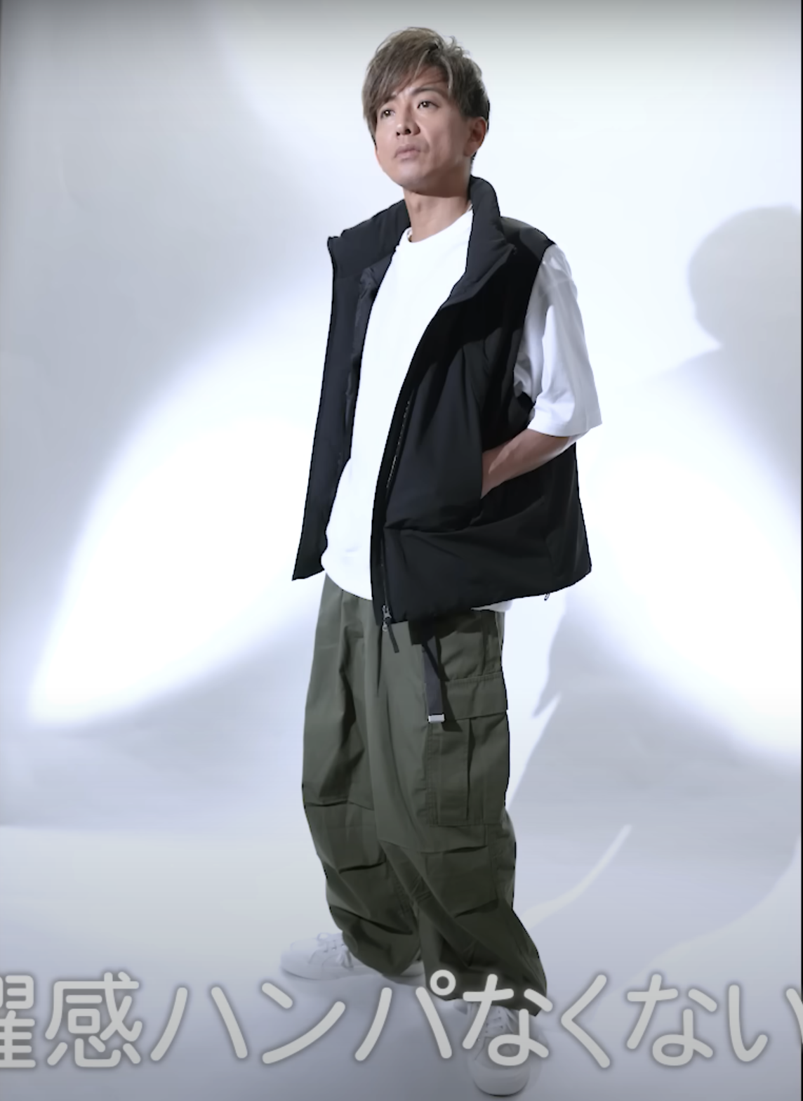 木村拓哉非常喜歡以白 TEE 為搭配打底,但在第七套則多加一件黑色HEAT PADDED背心,羽絨背心在秋冬穿保暖度高,加入立領設計時尚又大氣,下身混合深綠色超寬版工作褲,褲腳縮口可自由調節,側邊大口袋提升單品造型細節,是一套非常適合出去玩的裝扮,搭配心機在於露出尾端的腰帶,以工作褲混合,即使脫掉背心整體也不會過於隨性,再將褲腳拉繩稍微縮起來能製造長腿比例。