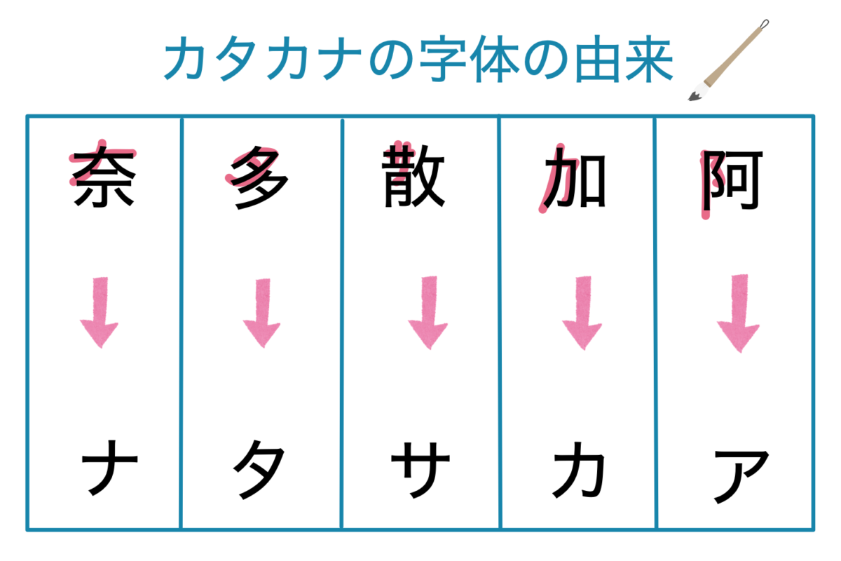 而目前有關於片假名的誕生最有利的說法,就是片假名是由某名僧人在學習漢文時,為了記錄筆記所創造。因為漢字結構複雜且行間狹窄,於是僧人便使用了漢字的一部分以作為標記。而片假名也是由此而來。這樣較為簡單的文字結構,也讓日文變得更加容易讀寫,也增加了許多平民識字的機會。