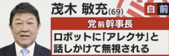 接下來的這位茂木敏充參選人的自我介紹就令人有些啼笑皆非了,他的自我介紹是「向Alexa搭話卻完全被無視。」雖然不知道實際的情況,但目前全日本被AI無視的參選人應該只有這一位吧!