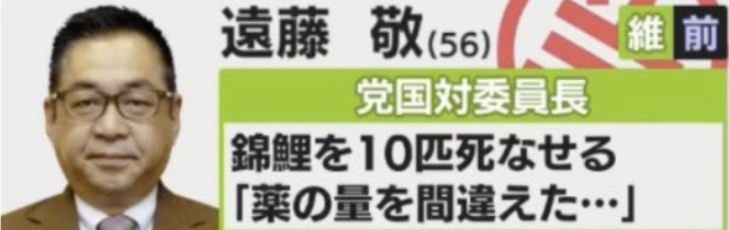 首先讓我們來看看這位名為遠藤敬參選人的自我介紹吧。他的自我介紹是「因為搞錯了藥的份量,不小心養死了10條錦鯉。」雖然聽上去讓人非常傻眼,但其實觀賞用的錦鯉的價格恐怕會遠遠超出大家的想像,所以這位很不小心的遠藤先生可以說是損失慘重。