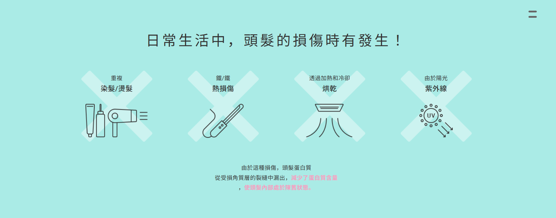 頭髮乾枯、毛躁、分岔、斷裂甚至掉髮,種種原因都是因為頭髮中的蛋白質被洗掉了。日常生活中,造成頭髮損傷的狀況隨時都在發生,譬如重複性的染燙頭髮,吹風機及電捲棒造成的熱損傷,陽光直射的紫外線傷害...等等,以上種種原因,都會造成毛鱗片受損,進而導致蛋白質從受損的角質層流出,而頭髮內部則處於陳舊狀態。