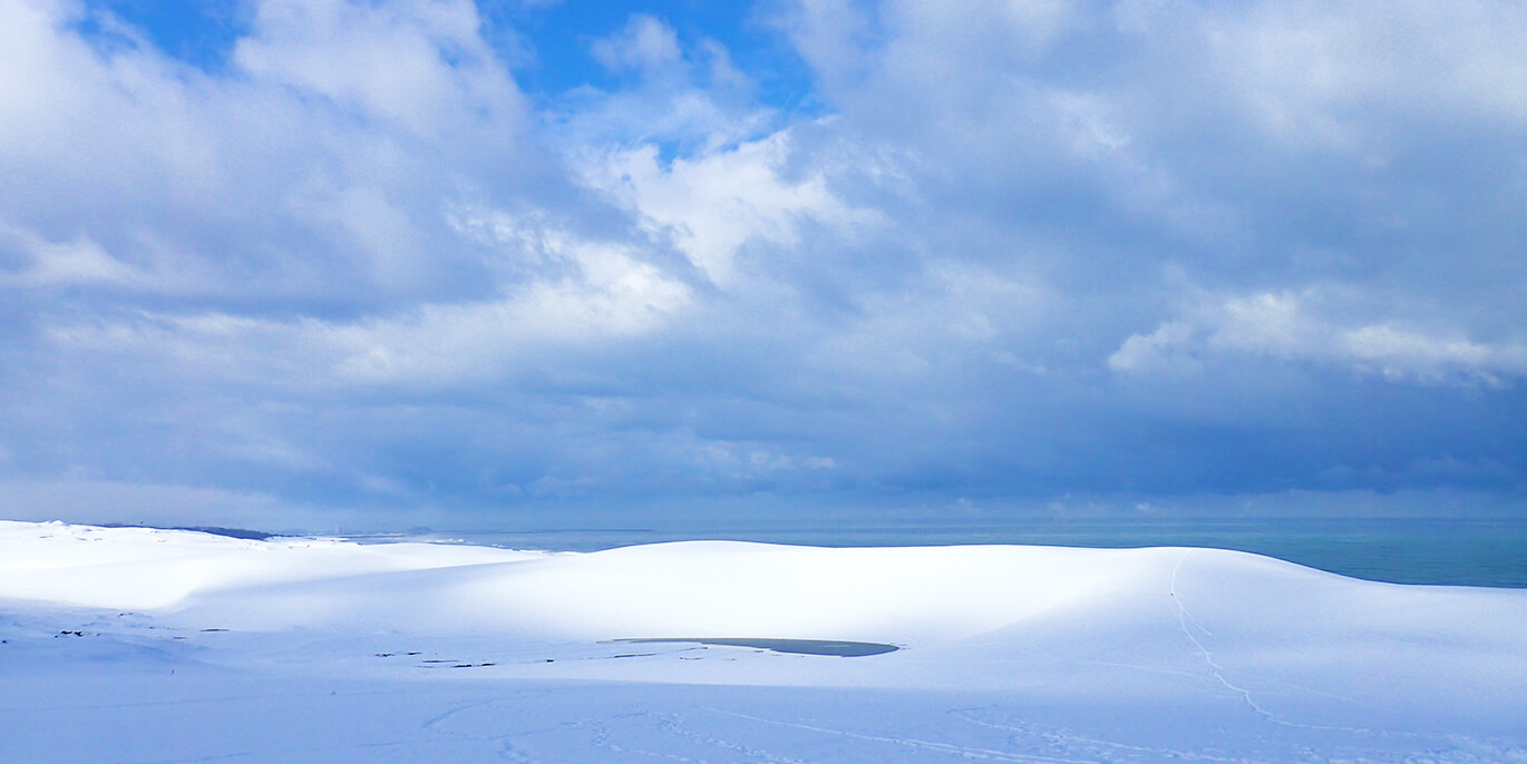 鳥取砂丘是日本最大規模的海岸沙丘,由於整片砂土大地沒有遮蔽物,與蔚藍的天空和壯麗的海洋融為一體,所以被譽為「奇蹟的造形美(奇跡の造形美)」。這片壯麗的沙之大地綿延約16公里,起伏不平,彷彿置身於沙漠般的異國風情,讓人深刻感受到大自然的雄偉力量。廣闊的沙灘隨著天氣和風向的變化,展現出不同的風紋、沙簾和沙柱等紋理,因此每次造訪都能見到不同的沙丘面貌。特別是在冬季,下雪後的鳥取砂丘被一層銀白覆蓋,成為宛如童話般的銀色世界,景致極為夢幻。