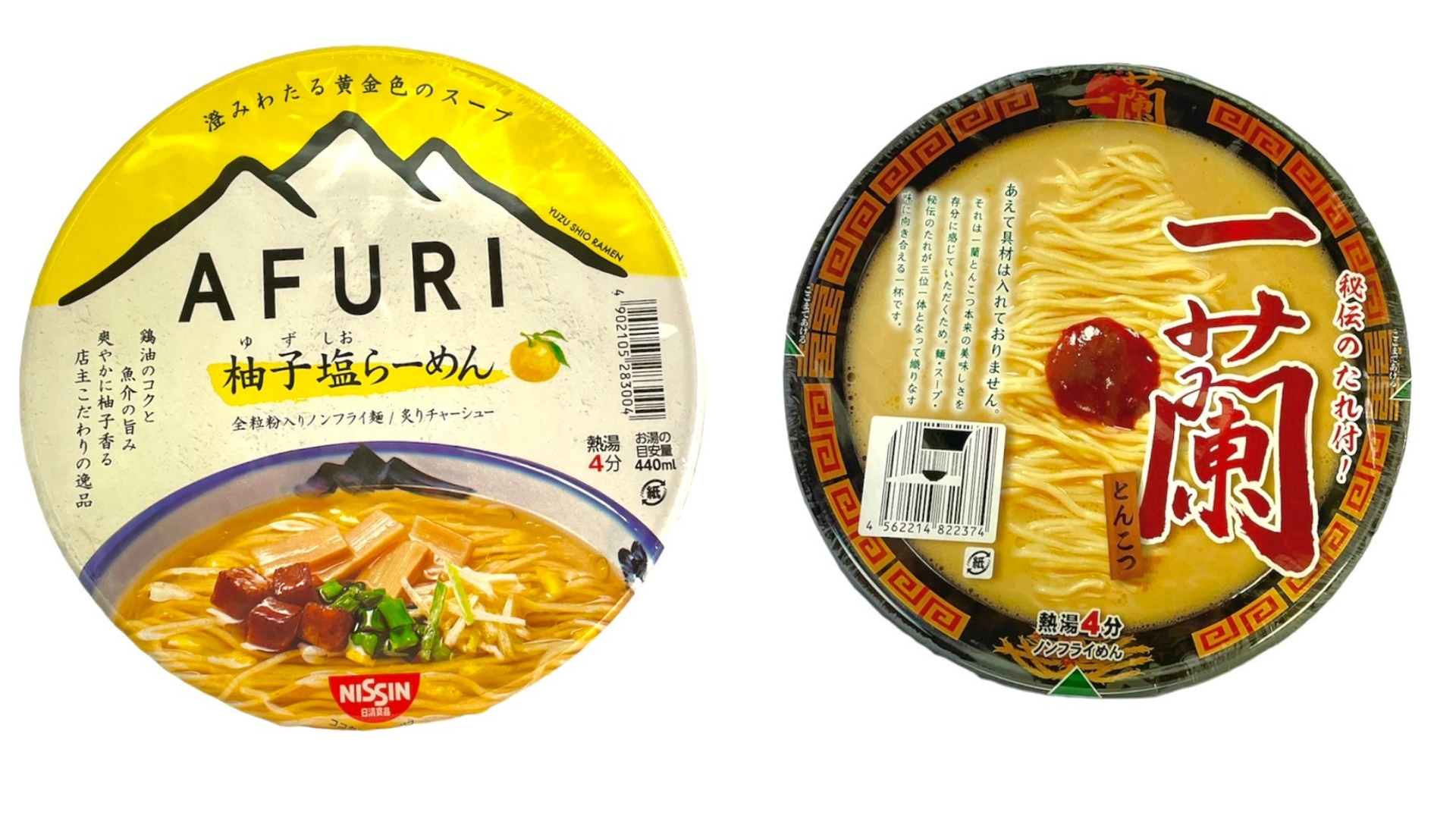 左圖「日清 AFURI柚子鹽味拉麵 92g」/右圖「一蘭拉麵 豚骨碗麵 138g」