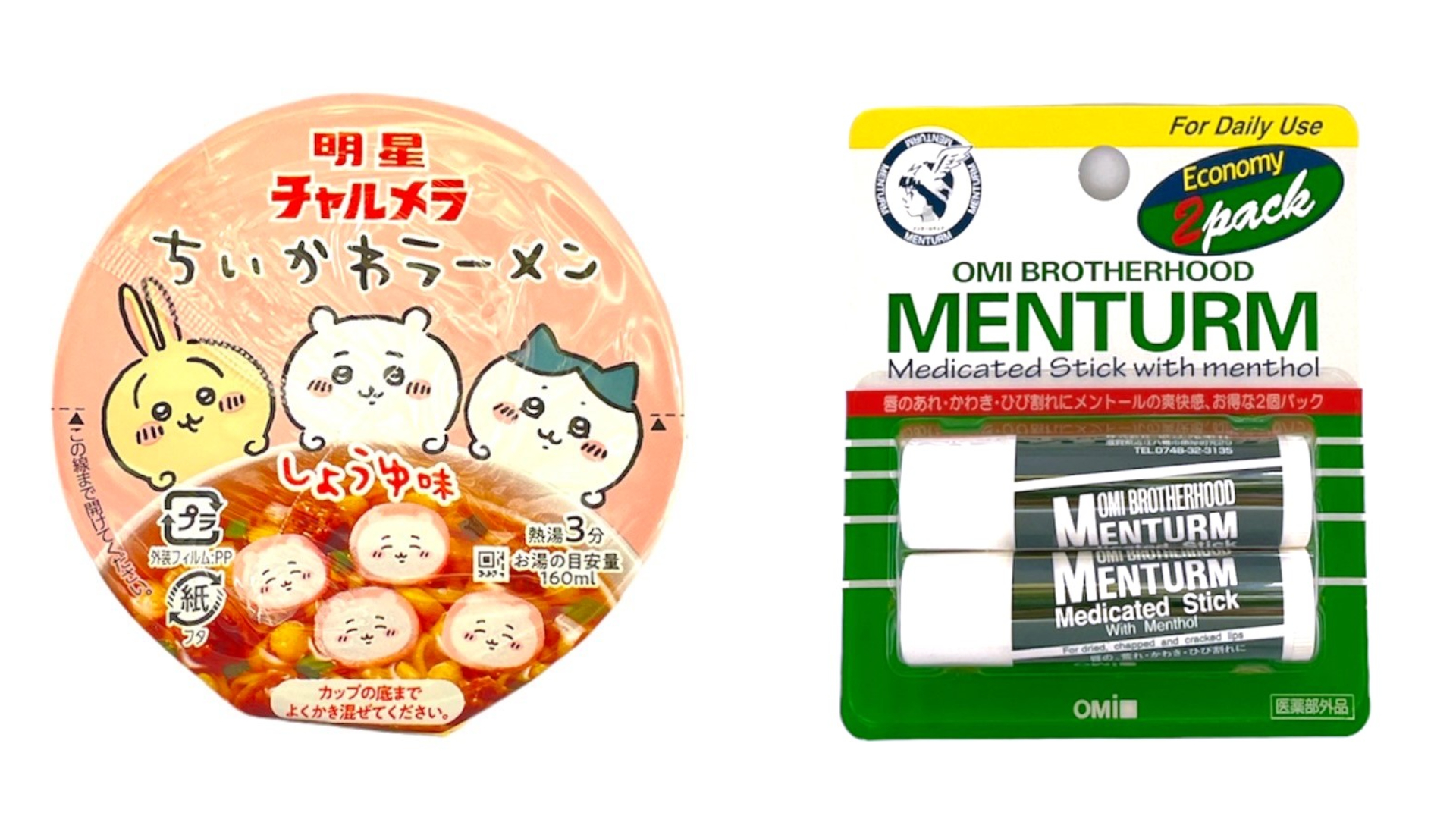 左圖「明星 吉伊卡哇醬油拉麵迷你杯麵 35g」/右圖「近江兄弟社OMI 保濕修護護唇膏 2入」