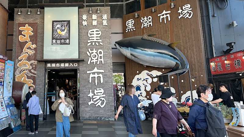 歌山縣那智勝浦町是全日本鮪魚漁獲量最高的地方,因此黑潮市場門口就有一隻巨大的鮪魚迎接來此的遊客。每天12點30分都會在市場內舉辦鮪魚解體秀,週六週日則是有三場,分別在:11點、12點、15點舉行。