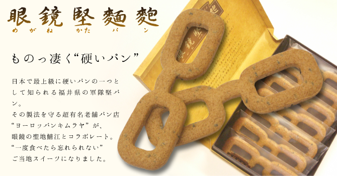 以製造眼鏡聞名,擁有超過100年歷史的福井縣鯖江市,推出了以眼鏡為主題的特產—眼鏡口糧餅(眼鏡堅パン),由創業接近百年的老字號麵包店「Europain KIMURAYA」監修,將在大東亞戰爭時期深受士兵喜愛的軍用口糧餅,進行象徵性的創新設計。無論是獨特的味道,還是其讓人印象深刻的硬度,這款口糧品都值得品嚐看看!由於烘焙得非常硬,建議先將口糧餅掰成小塊再食用。一旦咬下,濃郁的芝麻香氣便會充滿口腔,帶來懷舊的風味與獨特的口感。