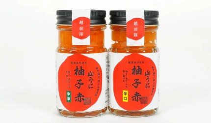 「山海膽柚子辣醬山海膽柚子辣醬(山うに 柚子赤 )」是將柚子泥、赤萬願寺唐辛子、鷹爪辣椒以及鹽碾碎後使用研缽混合成糊狀的調味料,因其外觀酷似海膽而得名。「山海膽」是福井縣鯖江市河和田地區擁有超過300年歷史的傳統調味料,其中「柚子辣醬」更是「山海膽」中的頂級品牌。款調味料結合了柚子的清新香氣與辣椒的爽口辛辣,無論搭配火鍋、烏龍麵、蕎麥麵等麵類,還是肉類料理、開胃小點(如法式薄餅),都能相得益彰。