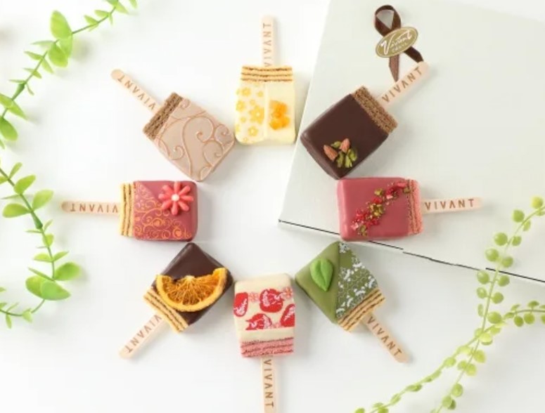 這款外型宛如冰淇淋的可愛甜點「VIVANT BAR」,以福井縣產越光米製成的米粉製成,每片層層堆疊、共16層的年輪蛋糕切片,裹上濃郁巧克力,再搭配新鮮水果裝飾,既富創意又美味十足。不僅口感豐富,外觀也十分吸睛。