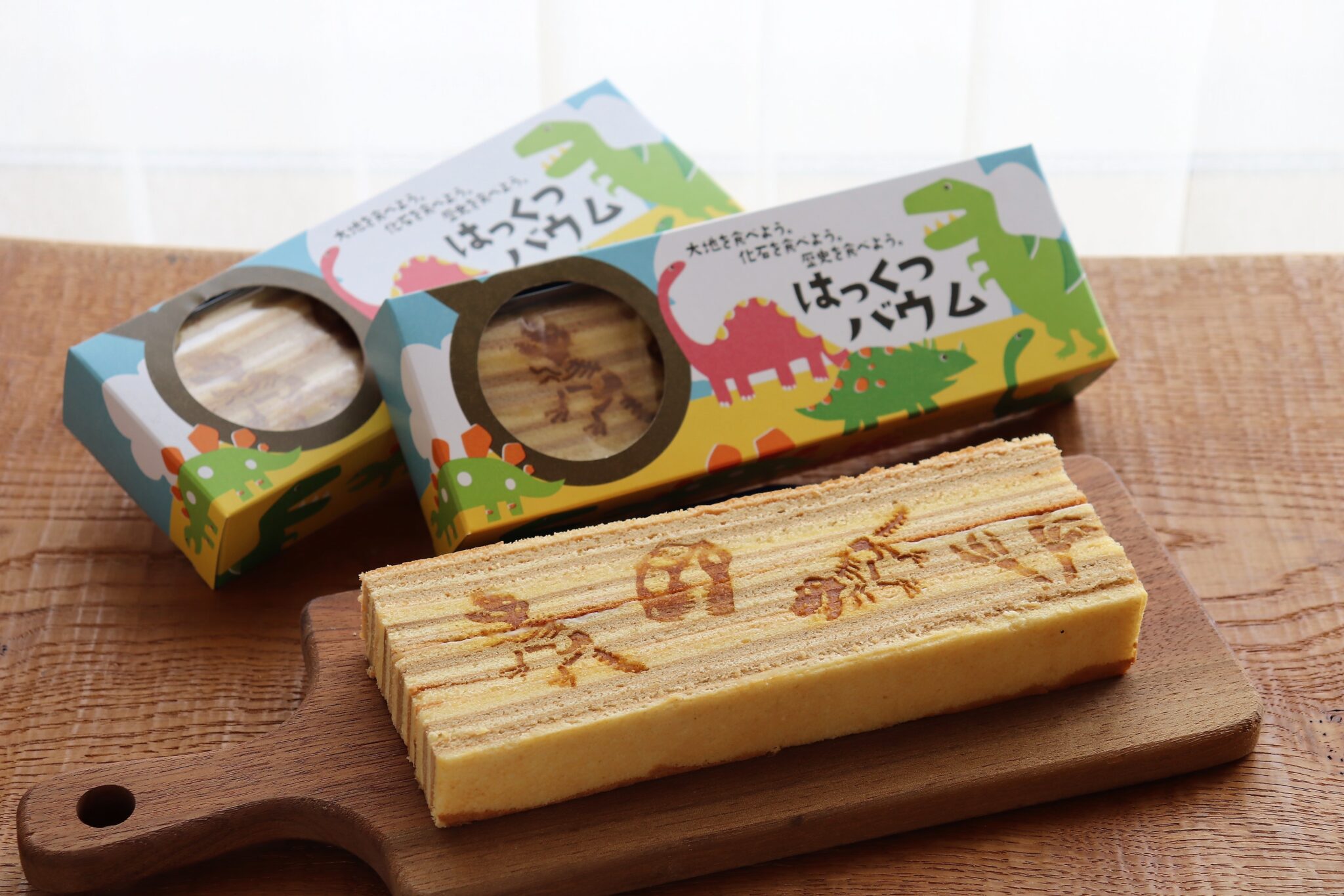 福井縣擁有日本最大的恐龍化石挖掘地,被譽為「恐龍王國」。因此,特別推出了以恐龍為發想的伴手禮「發掘年輪蛋糕(はっくつバウム)」,希望藉由恐龍的魅力,讓人們更加深入地了解福井的歷史與文化。