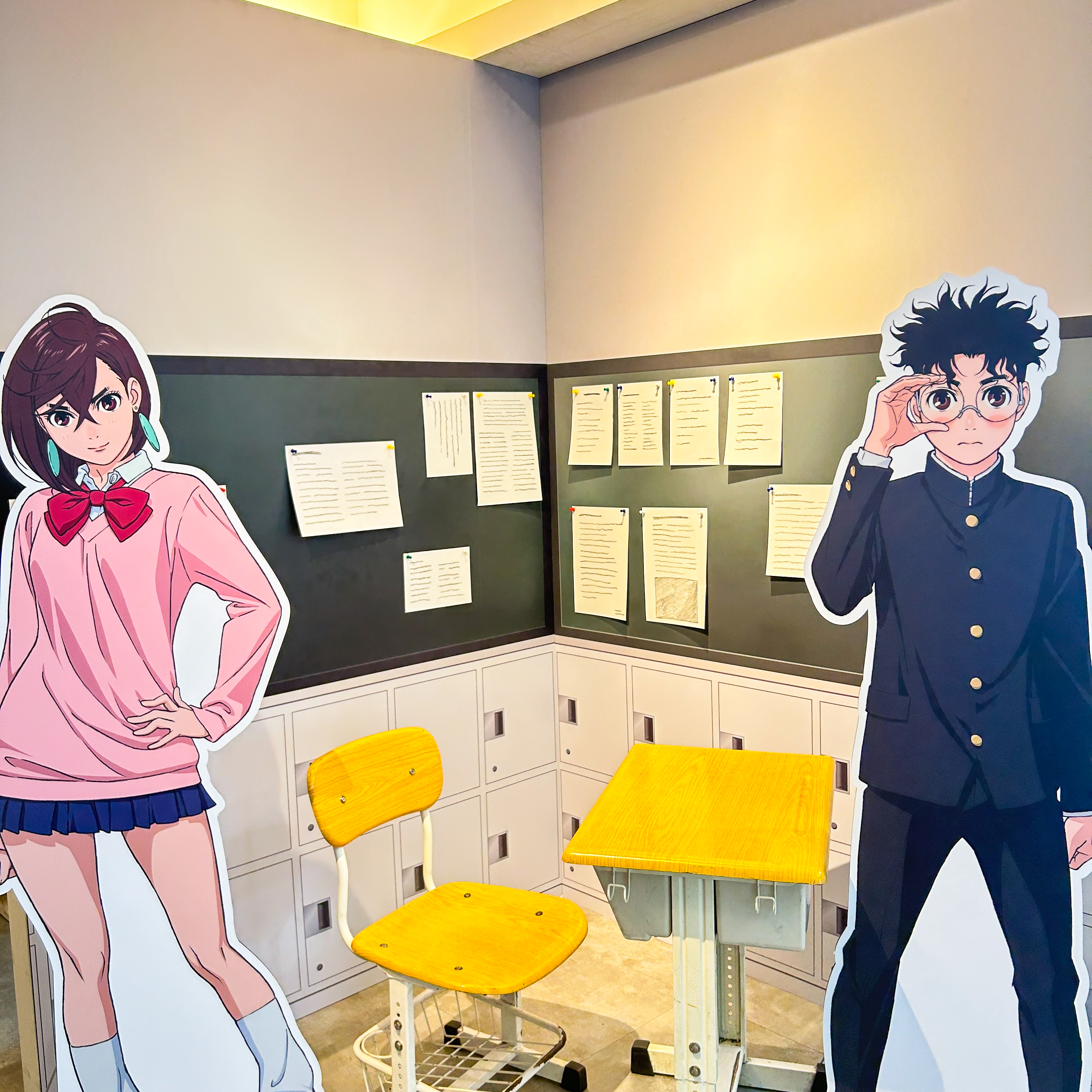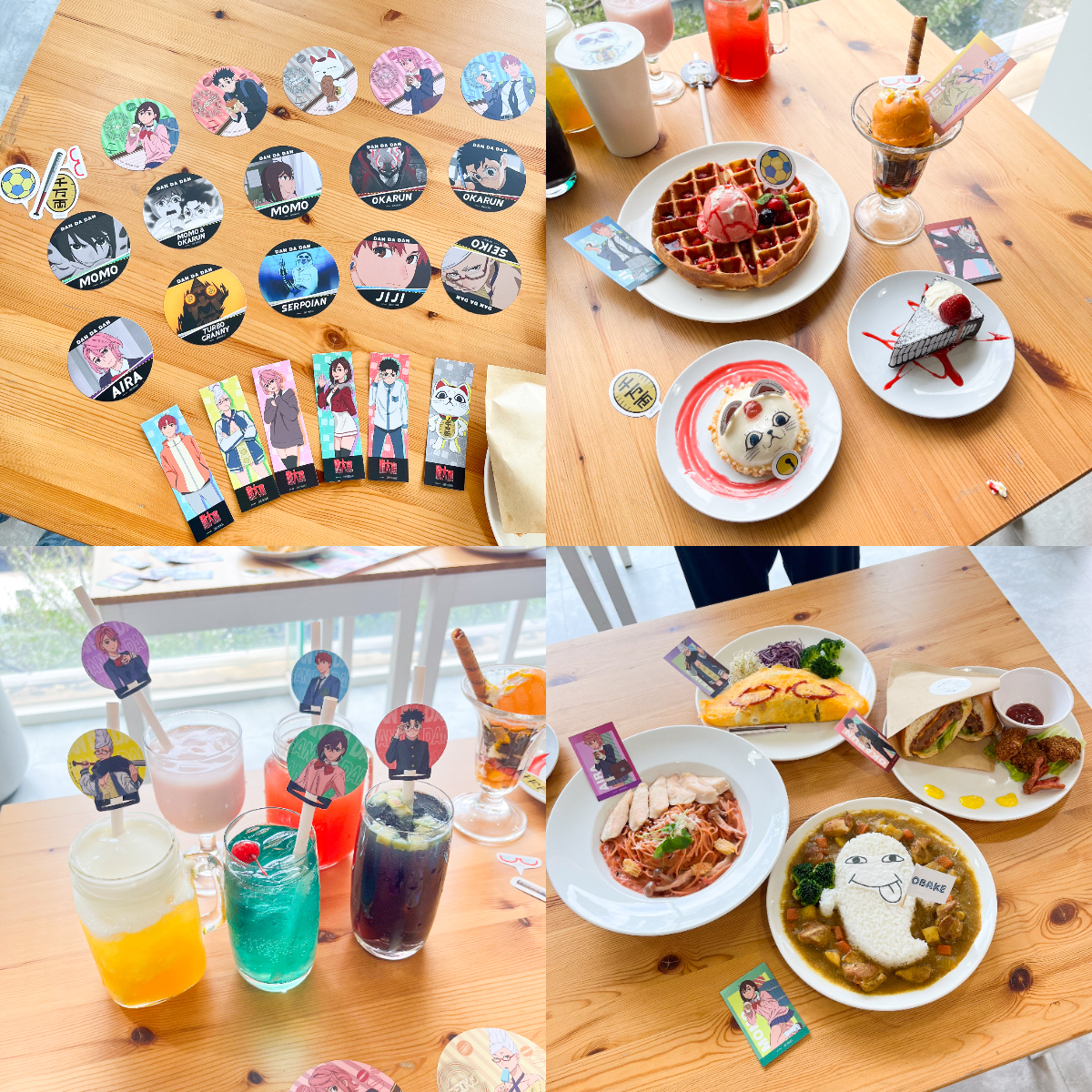 現場有小桃、厄卡倫、愛羅、星子、寺仁的1:1角色立牌立牌及場景窗貼,打造馬卡龍色系的繽紛用餐氛圍。在咖啡吧台區可以看到超多不同的幽靈與外星人們像是高速婆婆以及賽博星人等......而入口旁也有經典的劇照牆。台中店主題區重現小桃和厄卡倫搭電車的經典場景,台北店則有校園教室情景,兩位角色還分別穿上不同的造型的服裝,等著粉絲們一同來打卡。