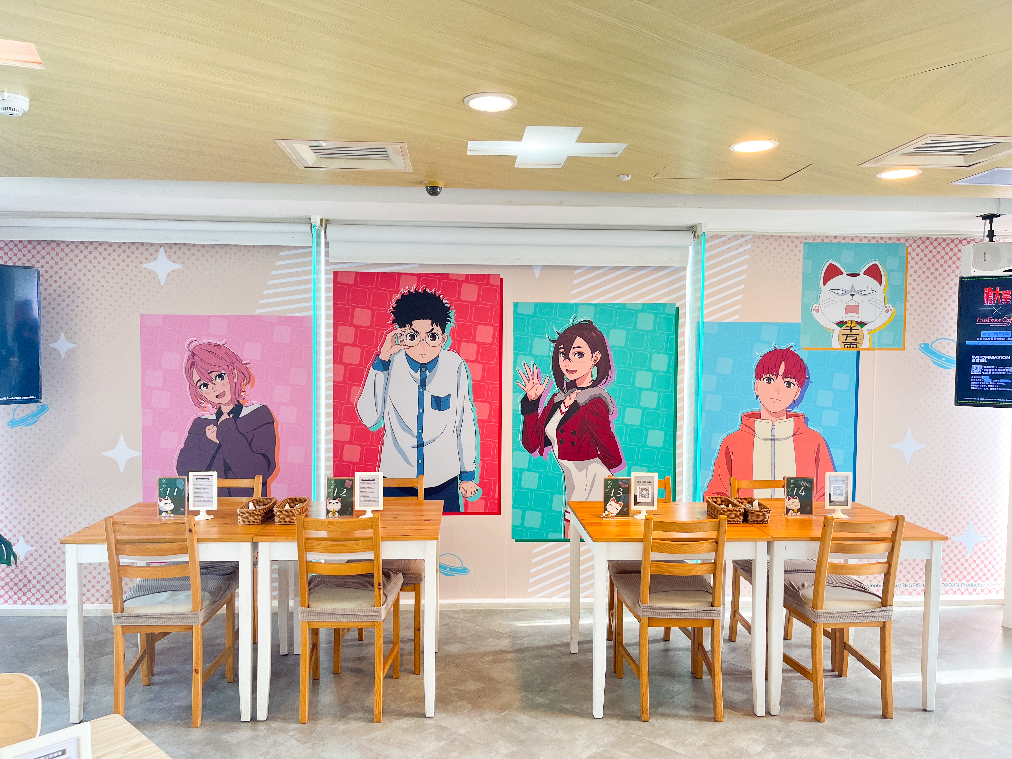 這次合作的最大亮點為FANFANS CAFÉ首發的全新立繪。這些角色設計由日方繪製,並未在日本公開發表,機會難得千萬不要錯過。像是現場的角色立牌、盲抽閃鑽徽章、壓克力鑰匙圈、防水貼紙、壓克力立牌、滿額贈L夾,而角色們手上都拿著不同的食物,風格上也有別於動畫中色彩強烈對比鮮明的普普風,運用活潑的馬卡龍色系呈現,完美展現角色在校園生活的輕鬆氛圍。