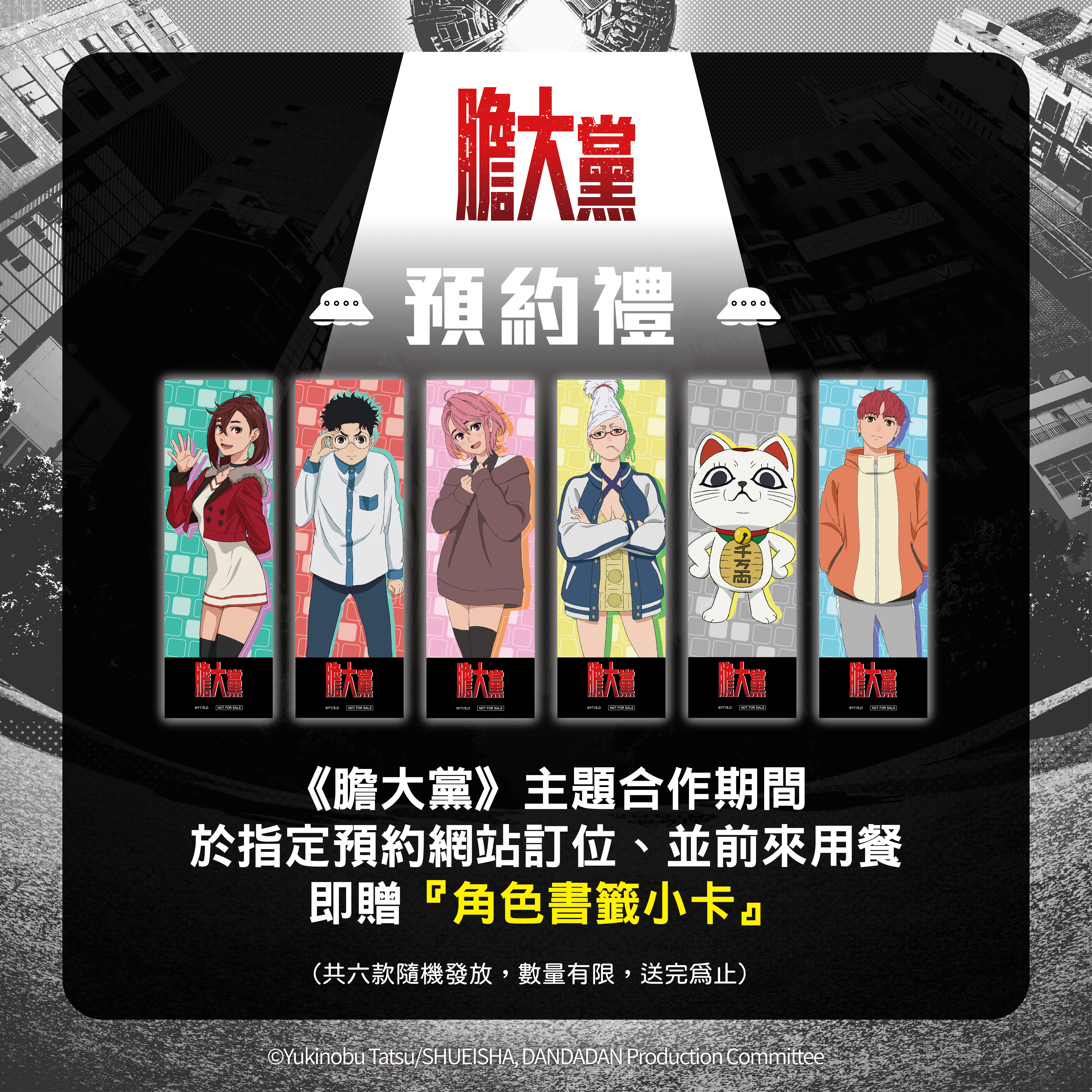 凡透過 FANFANS CAFÉ 指定預約網站預訂並前來用餐,即可獲得《角色書籤》乙張(隨機款式,共六款)用強烈對比的鮮豔色彩設計,必定成為粉絲珍藏的絕佳小物!想前往用餐的粉絲,請記得先使用網路訂位。