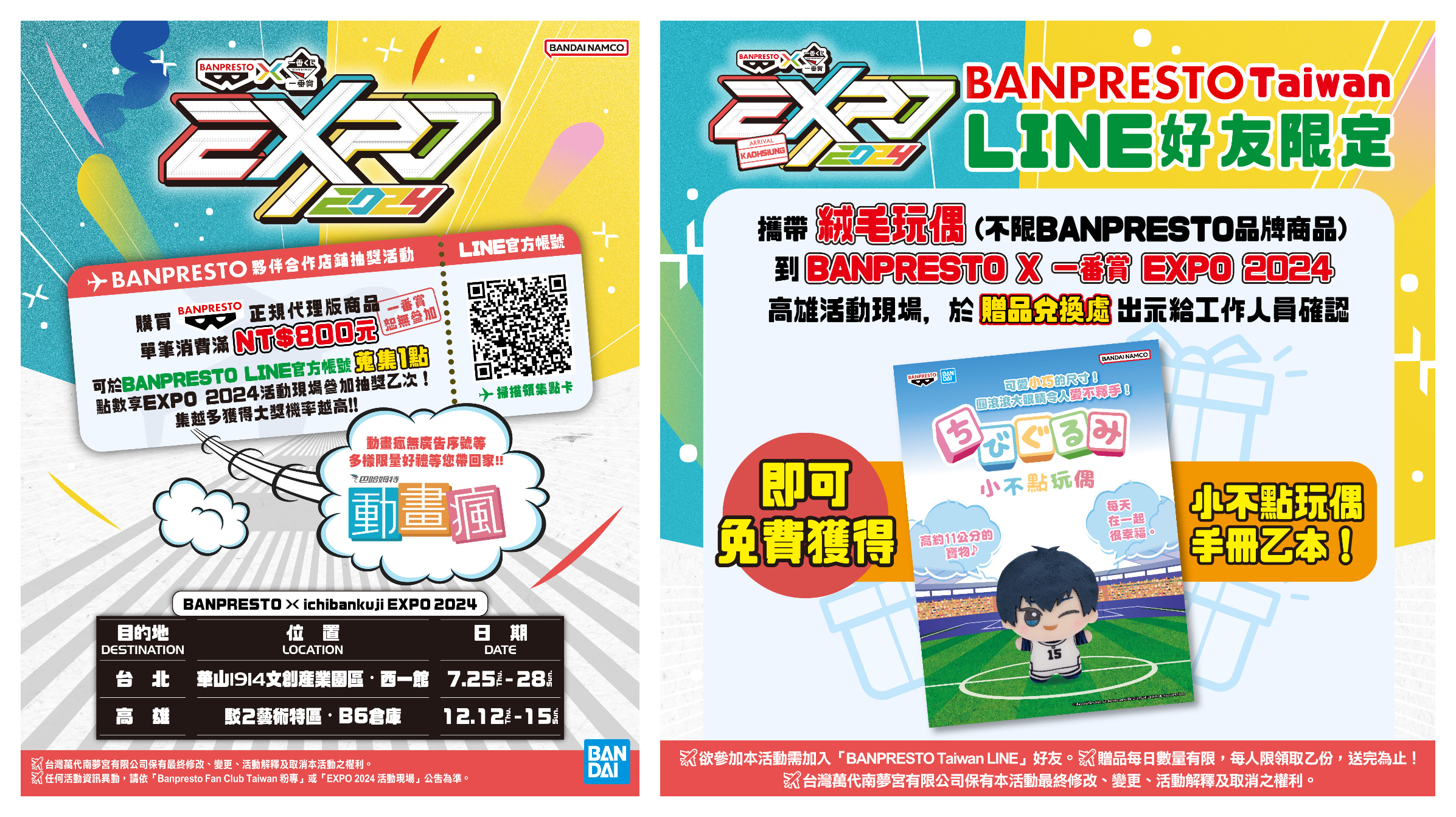 LINE好友示愛禮:成為BANPRESTO Taiwan LINE官方帳號好友後,將攜帶到EXPO 2024高雄活動現場的絨毛玩偶(不限BANPRESTO品牌商品)出示給工作人員確認,即可免費獲得小不點玩偶手冊乙本!