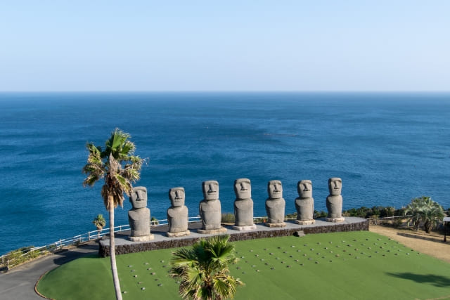 「日南太陽花園」的最大亮點摩艾石像,高達約5.5公尺,是世界上首批經復活節島長老會正式許可後,完全復刻而成的。七座摩艾石像分別代表不同的願望,從右至左依次是學業運、財運、婚姻運、地球和平(願望成真)、戀愛運、健康運及事業運。據說觸摸摩艾石像還能幫助實現願望。此外,摩艾(モヤイ)的「モ」代表未來,「ヤイ」代表生活,懷著這樣的心情欣賞摩艾石像,會有更深的感悟。背後蔚藍的大海與莫亞像完美融合,構成了一幅和平與美的畫面,不妨在此沉思和平的重要。