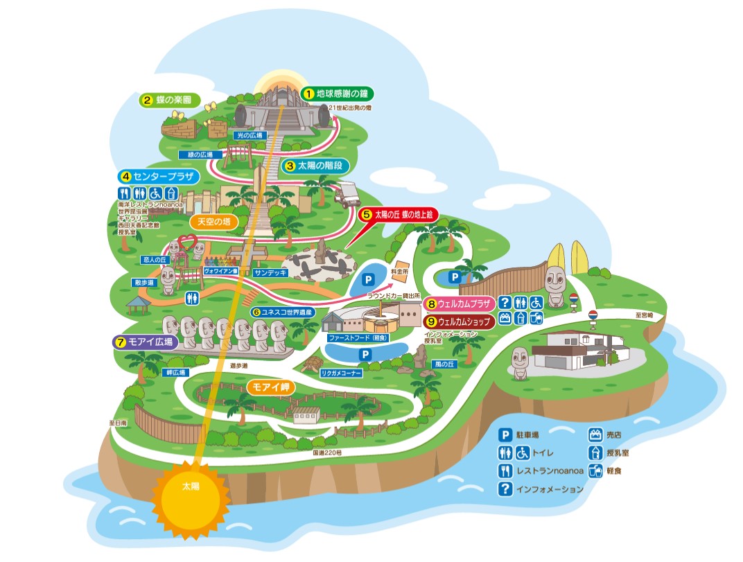 位於日南海岸一處小高丘上的日南太陽花園(サンメッセ日南),以壯觀的七座摩艾石像(モヤイ像)聞名。這座公園於1998年成立,旨在祈願地球和平。整個園區占地約20公頃,除了引人注目的莫亞像外,還有「地球感謝之鐘」、「世界昆蟲館」以及「蝴蝶地面畫」等景點,非常適合慢慢遊覽。