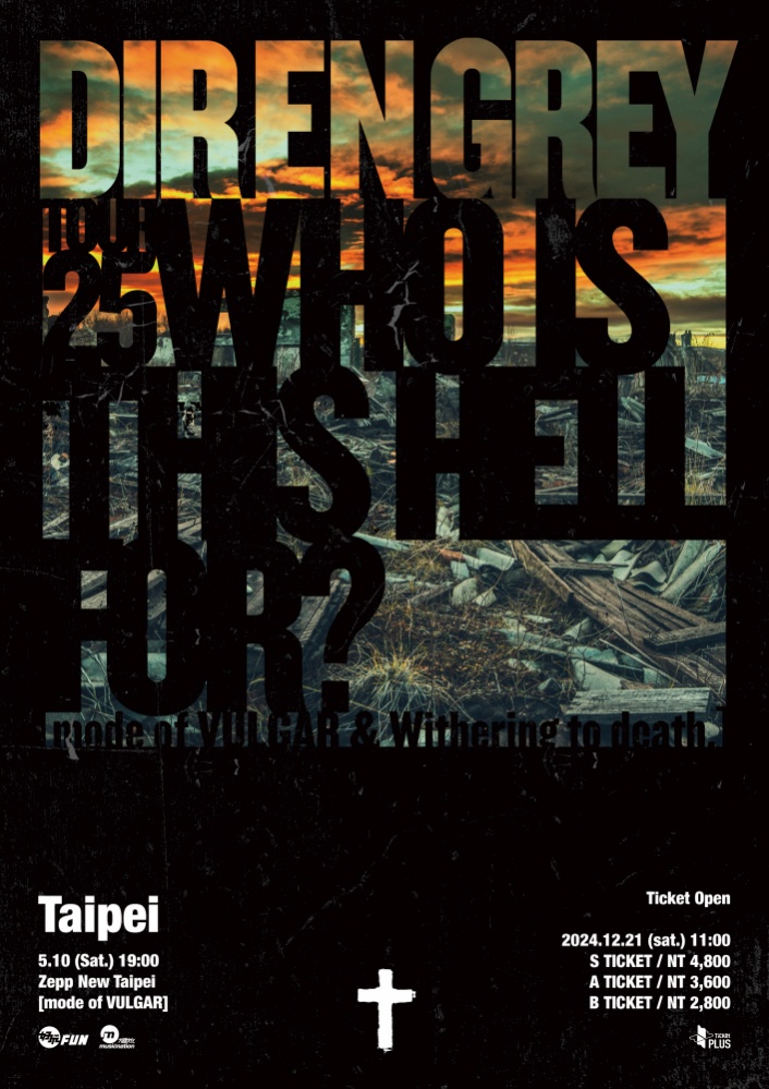 DIR EN GREY「TOUR25 WHO IS THIS HELL FOR?」台北演唱會,分有S TICKET / 4800元、A TICKET / 3600元、B TICKET / 2800元,其中S & A TICKET都有資格加購特典。台北場演唱會門票將於 12月21日上午11:00在遠大售票系統正式售票。