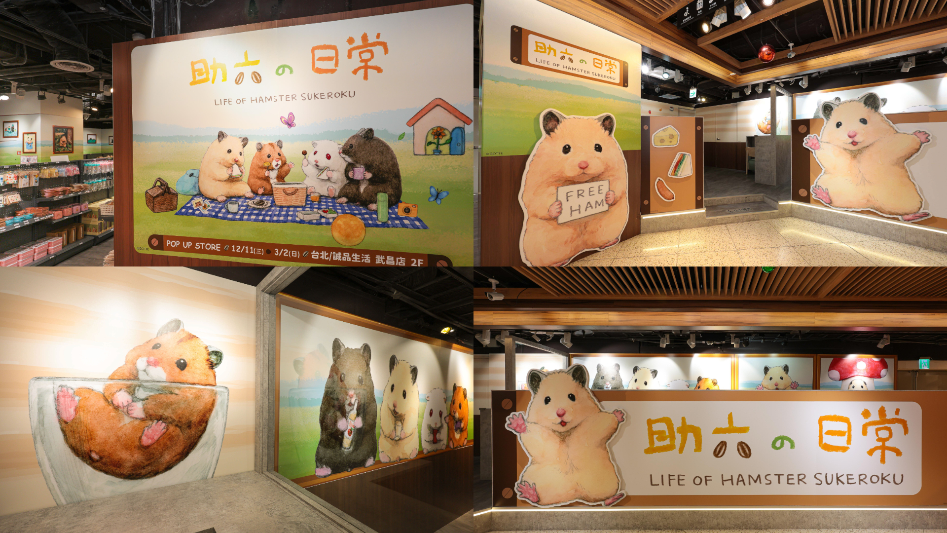 一到快閃店就會看到「主視覺打卡牆」,助六和次郎帶著三明治與朋友們一起去野餐,旁邊還有蝴蝶與向日葵真的超愜意!往前走是「倉鼠玩耍中」,助六與朋友們打電動,還有裝扮成蘑菇的模樣實在太可愛啦!左手邊「免費火腿募集中」助六手上舉著Free Ham的牌子,楚楚可憐的模樣讓人想把全世界的火腿都給他!後面還有「倉鼠排排站」三隻倉鼠萌萌地站在這邊等你來陪陪他們唷!「向日葵花園」中則有許多向日葵花及助六愛吃的食物,旁邊還有「一杯鼠」買完飲料別忘了在這邊拍一張!對面的「向日葵看書」連向日葵都在看書了,你有什麼理由有不努力呢?商售區牆面則是充滿「日常生活相框」有著倉鼠們切麵包、喝酒、玩耍等各個日常生活時刻,想被療癒的粉絲們趕快來吧!