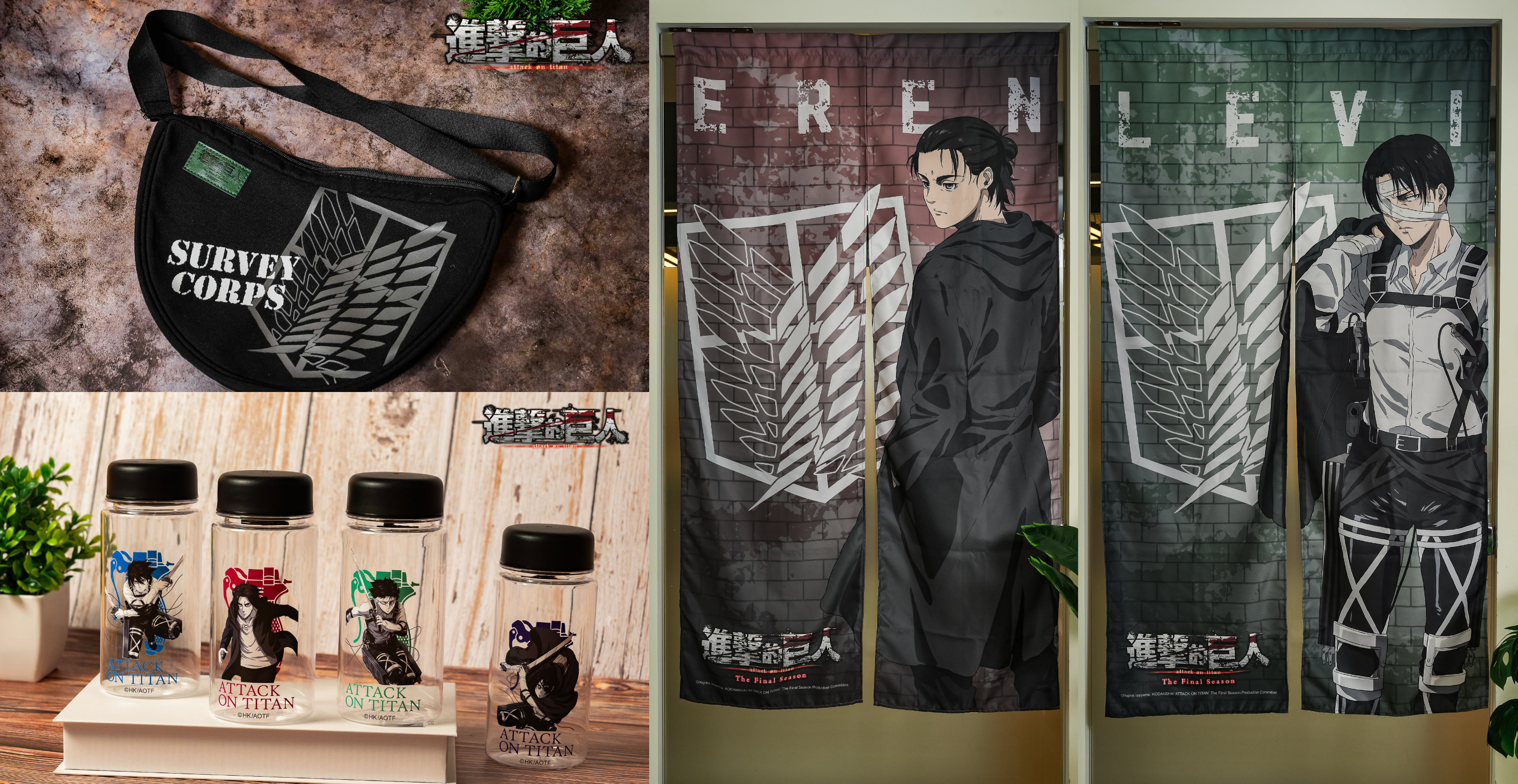 光看動畫還不夠!生活也要有《進擊的巨人》陪伴,里維「冷水壺」陪你走遍各個角落,真是輕巧好攜帶,外出就背調查兵團「側背包」兩把硬質刀圖樣超帥氣,還有艾連、里維及米卡莎款等你帶出門。超有質感的木紋怎麼能不愛?「木杯墊」四位角色Q版造型配上日文版的獻出心臟吧文字,總之買下去就對了!喝水就要搭配「流沙杯墊」艾蓮、里維、米卡莎及漢吉有各自代表色,流沙滑下來瞬間帥又療癒!冬天用馬克杯喝熱飲必搭配「陶瓷杯墊」,圍紅圍巾的米卡莎沒有理由不買啊!艾連和李維「長門簾」掛在門上彷彿在邀請我們走向門簾的另一端,還有隨身可攜帶的「長方鏡」,不但可以照鏡子還可以看到艾連與里維的帥氣模樣,真的太超值!