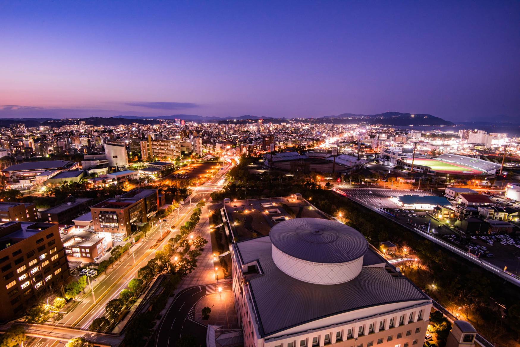 位於鹿兒島市中心的鹿兒島縣廳,是鹿兒島縣的行政中心。本廳大樓18樓的展望大廳開放至晚間九點,不僅可以免費欣賞錦江灣與櫻島的壯麗景色,入夜後還能從北側眺望如夢似幻的市區夜景,深受遊客喜愛。