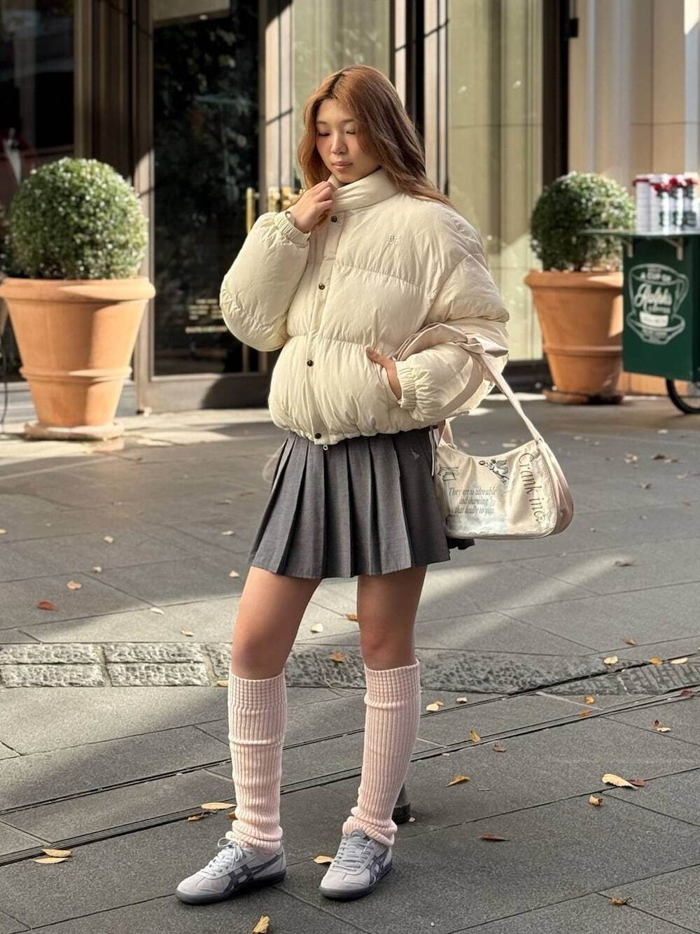 以羽絨外套、寬感上衣與褲襪的搭配組合,堪稱是近期日本女生最愛穿搭之一,帶點軟萌感的衣著感受,非常適合冬季著用,當天氣變冷時,隨性圍上圍巾使造型保暖又凸顯細節焦點。