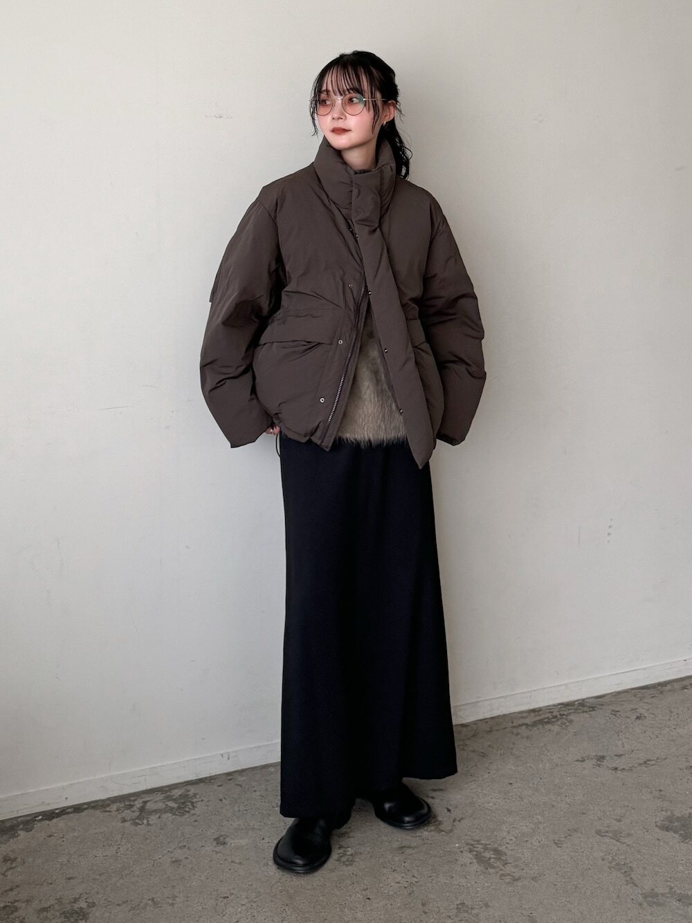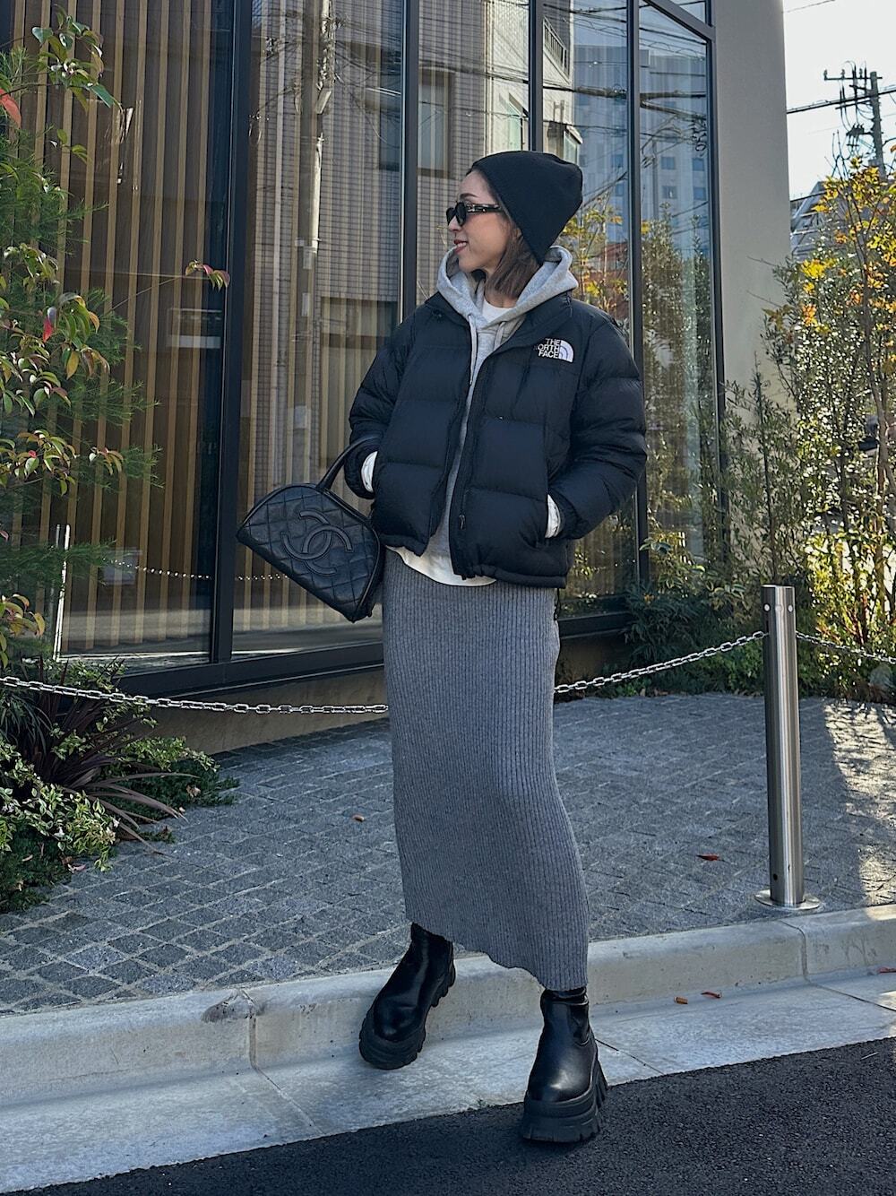 如果覺得露腿會稍顯寒冷的話,不妨嘗試換上針織長裙,尤其直筒剪裁的款式,能修飾下半身顯瘦感之外,同時平衡羽絨外套的蓬鬆感,製造上寬下窄的造型比例,不論內搭連帽上衣、針織衫都很合適。