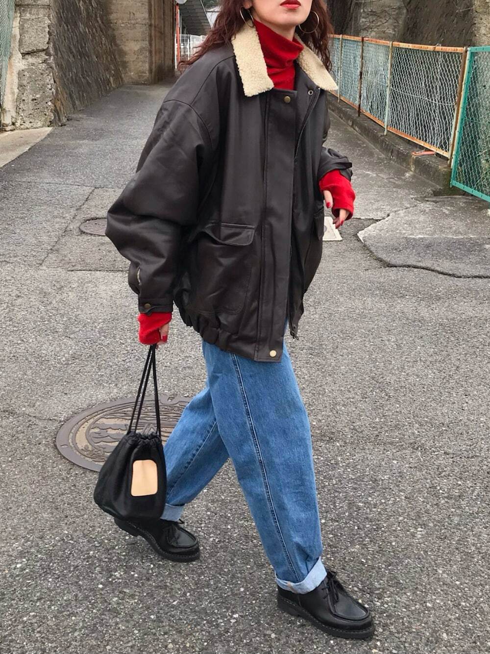 保暖材質的針織衫,向來是天冷之際不可或缺的必備,而新年穿搭首選,可以選擇紅色針織衫為搭配,讓整體輕鬆注入加分的視覺,混合牛仔褲再疊加毛絨領皮衣外套就很好看。