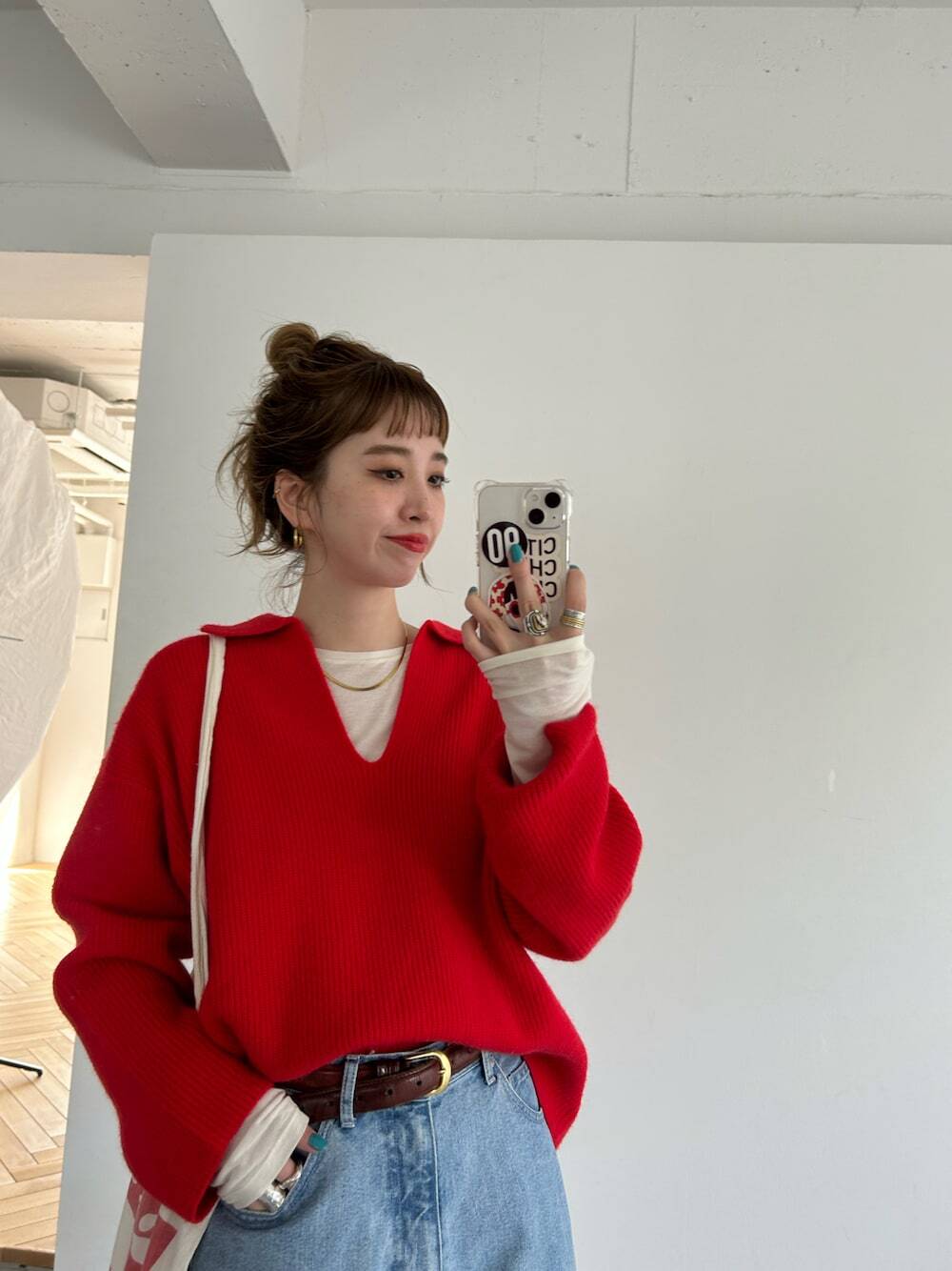 新年以「紅色單品」連結滿分節日穿搭推薦LOOK 01.紅色針織衫