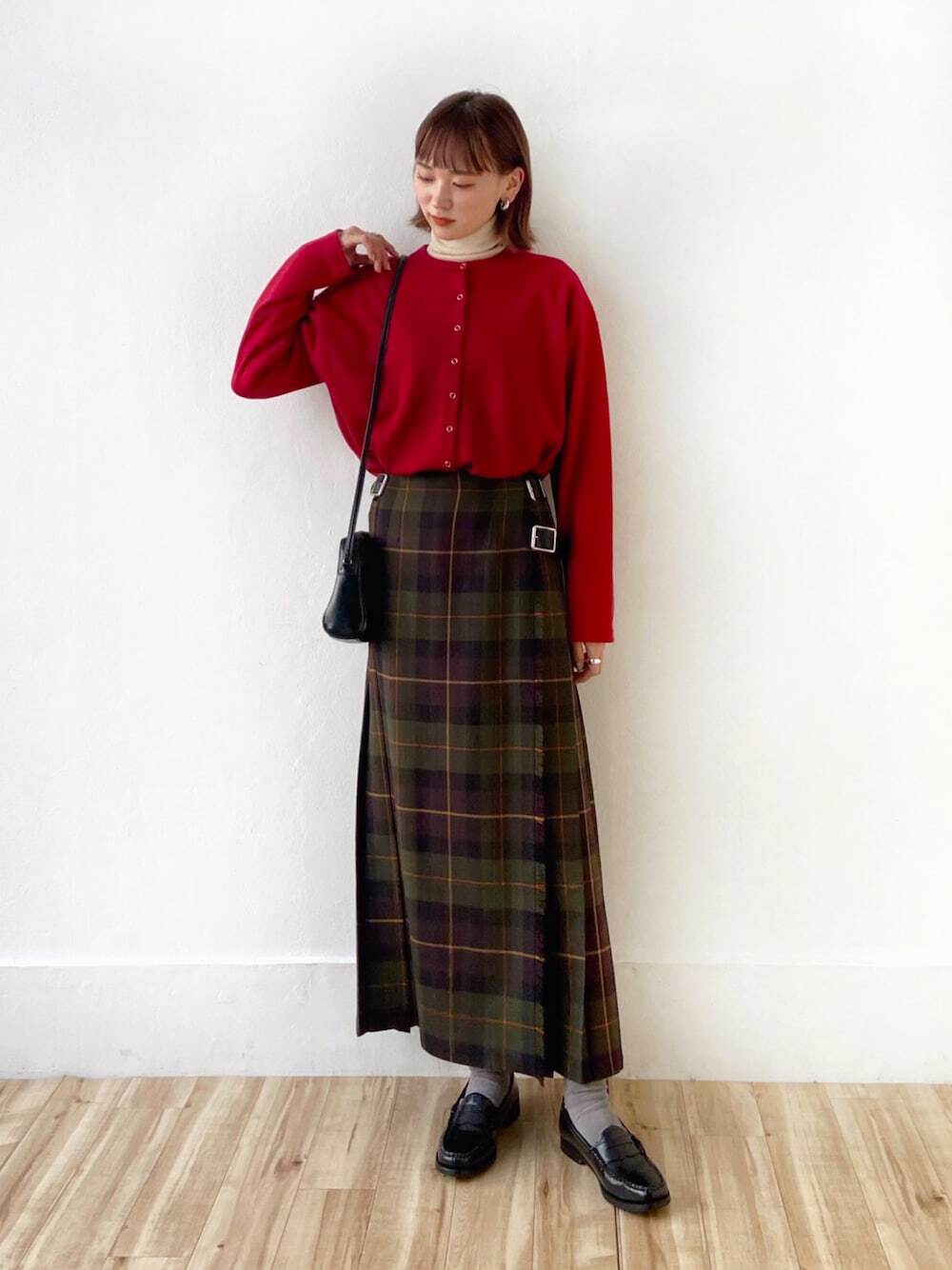 喜歡優雅風格的你,不妨嘗試以紅色開襟衫混搭,排釦設計的款式,能隨性變化出層次豐富的造型印象,例如透過高領上衣 + 紅色開襟衫,立即點亮細節層次,並加上短裙、格紋直筒裙,展現女孩感滿滿的日系氣息。