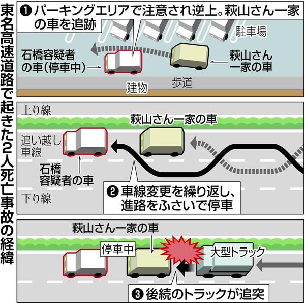 21點33分,石橋和步在高速公路上不斷對該車輛進行騷擾,包括超車至該車前方後突然減速,在對方變換車道的同時也跟著變換車道至其跟前等等。21點34分,石橋和步逼停了該車輛,並且走向車旁對嗆聲的萩山嘉久進行施暴,直至同車輛的同行者制止,才停止了該行為,正當石橋準備走回車上時,一台卡車從後方追撞了上來,被攔停車輛的萩山夫妻因此死亡,而石橋和久也重傷入院。