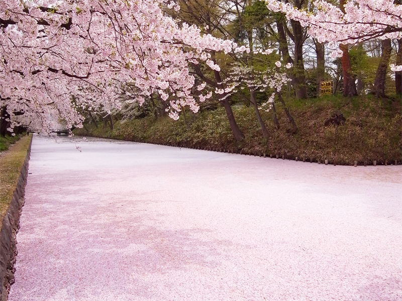 弘前城內有約50種共2,600株櫻花樹,以染井吉野為主,每到春天便成為著名的賞櫻名所。櫻花花瓣漂浮於護城河水面,形成如同船隻般的「花筏(はないかだ)」;或鋪滿水面的「櫻花地毯」,為整座城池增添詩意與浪漫。
