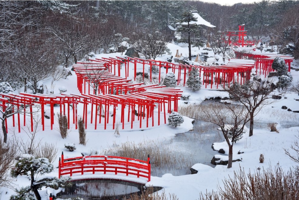 而神社內最具特色的是只有在此處才能看到的「千本鳥居」,這裡的鳥居高度約2公尺,延綿不斷,春天的櫻花、夏季的新綠、冬天的白雪,都讓朱紅色鳥居更加耀眼奪目,成為深受歡迎的攝影打卡景點。此外,無數排列的稻荷神(狐狸石像)也格外引人注目,壯觀的景象令人印象深刻,也被譽為充滿能量的熱門景點。