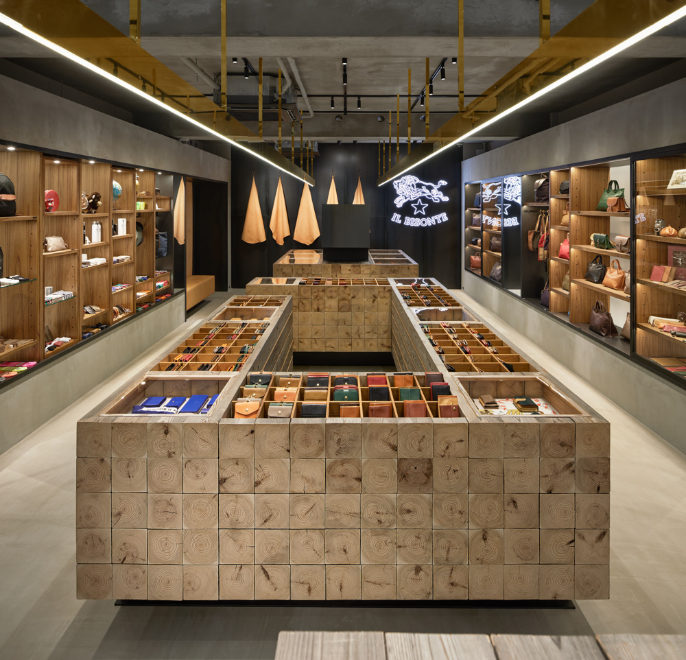 身為全國總店鋪的「IL BISONTE表參道店」,店鋪的陳列與設計相當講究。店內結合舊木材、黑皮鐵與水泥等材質,營造自然質感與現代風格交融的空間。店內設有專為小型皮具設計的特殊展示架,讓顧客可以更加輕鬆的挑選商品,是充分展現品牌特徵與理念的代表店。