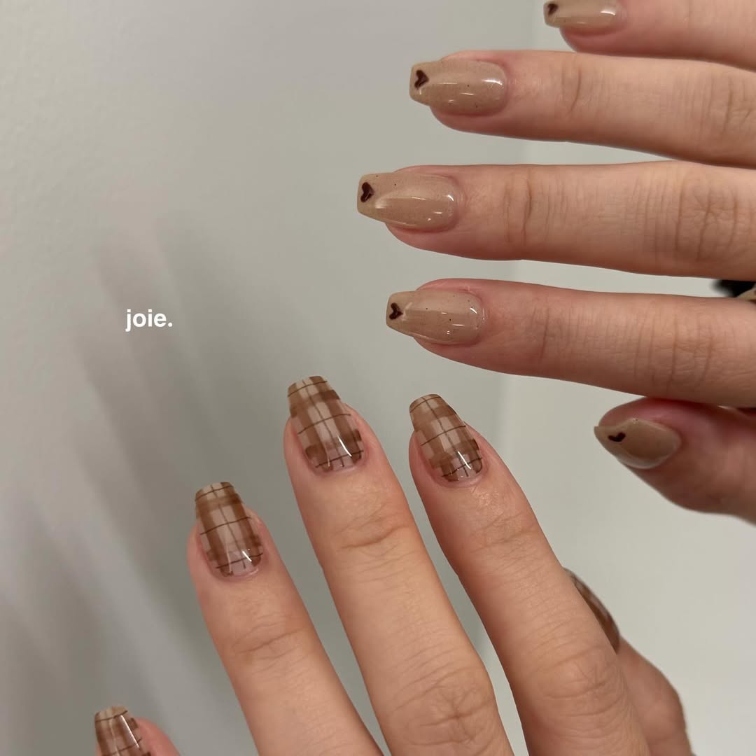 「格紋」一直以來都是冬季很夯的元素之一,尤其今年格紋可說是炙手可熱的單品,不妨將它放入指彩內,並搭配年度色「摩卡慕斯」混合,把雋永與時尚完美加乘,例如摩卡慕斯加膚色格紋,營造氣質滿分的指彩氛圍,並融入愛心圖案點綴,同時注入一股低調少女心。
