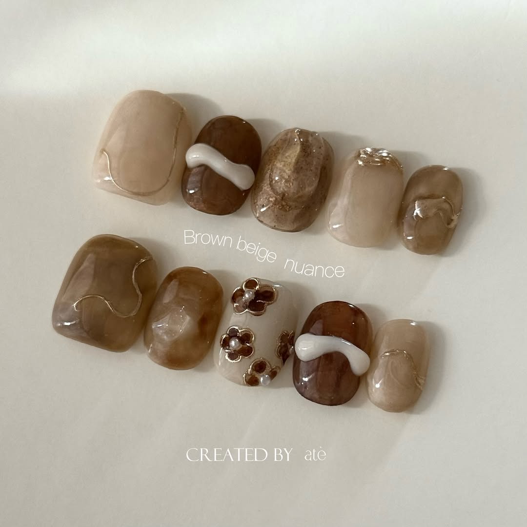 選擇「摩卡慕斯」為主色,再混搭漸層咖啡單色造型,不繁複的指彩風格,給人好感度加分的視覺印象,選搭可愛花卉、金屬線條、水珠、立體紋路為裝飾,使高雅摩卡慕斯 Look 立刻製造女孩氣息。