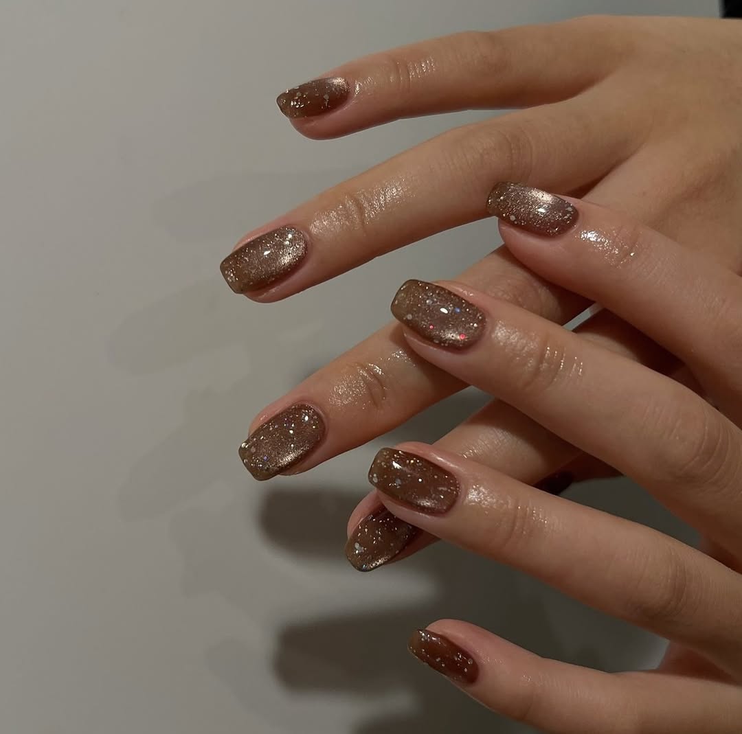 如果想讓指尖增添幾分貴氣感的話,不妨嘗試將摩卡慕斯 + 金色妝點,運用沈穩咖啡和高雅金的色彩組合,結合水鑽、金屬亮片、鏡面設計,輕鬆連結高級與時尚的日系造型。