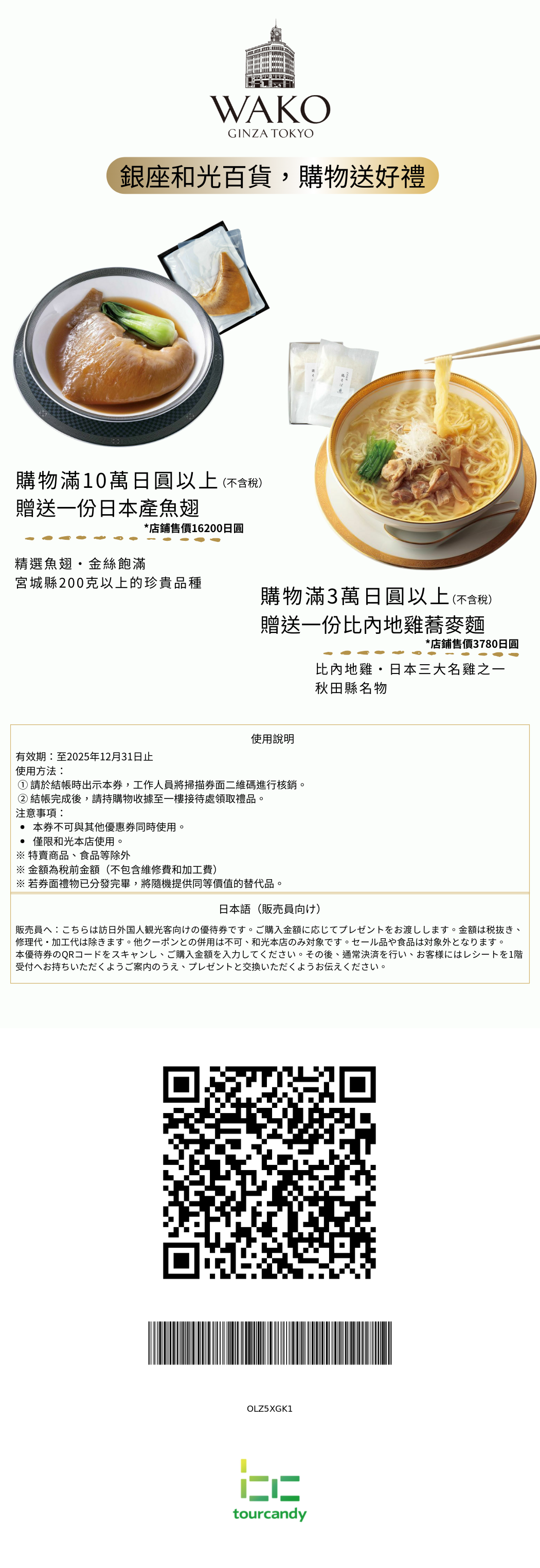 此券僅限訪日遊客使用。不可與其他優惠券同時使用。僅限和光本店使用。
