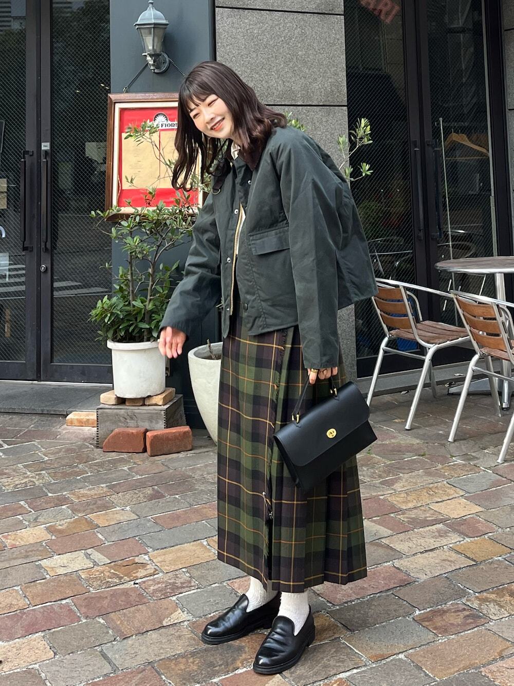 以近日超夯 Barbour 外套混搭格紋裙,帶點復古又帥氣的氛圍,輕鬆營造一股迷人的中性風格,再加入字母上衣合樂福鞋,使穿搭更完整加分。