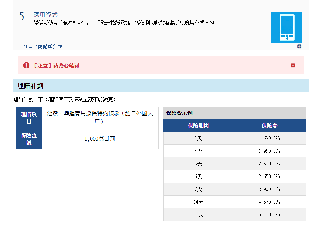 進入投保網站後,你就可以看到更加詳細的圖文以及資訊,包括理賠計畫,申請流程等等,像是你在日本停留幾天分別要花多少保金,理賠金額是多少,又分別提供了那些投保服務等等,都非常的簡單明瞭。