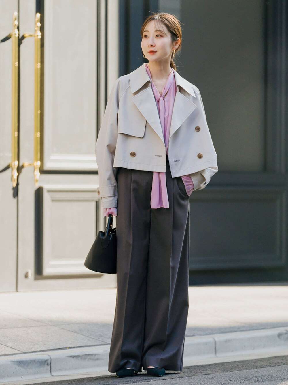 通勤族穿搭很適合透過短版風衣搭配,俐落簡潔的款式剪裁,能撐起幹練知性的衣著視覺,以短版風衣、領結襯衫、寬鬆西裝褲的混搭組合,使整體注入一股優雅兼具的日系大人感時尚。