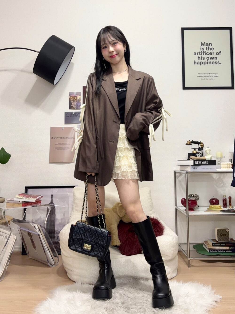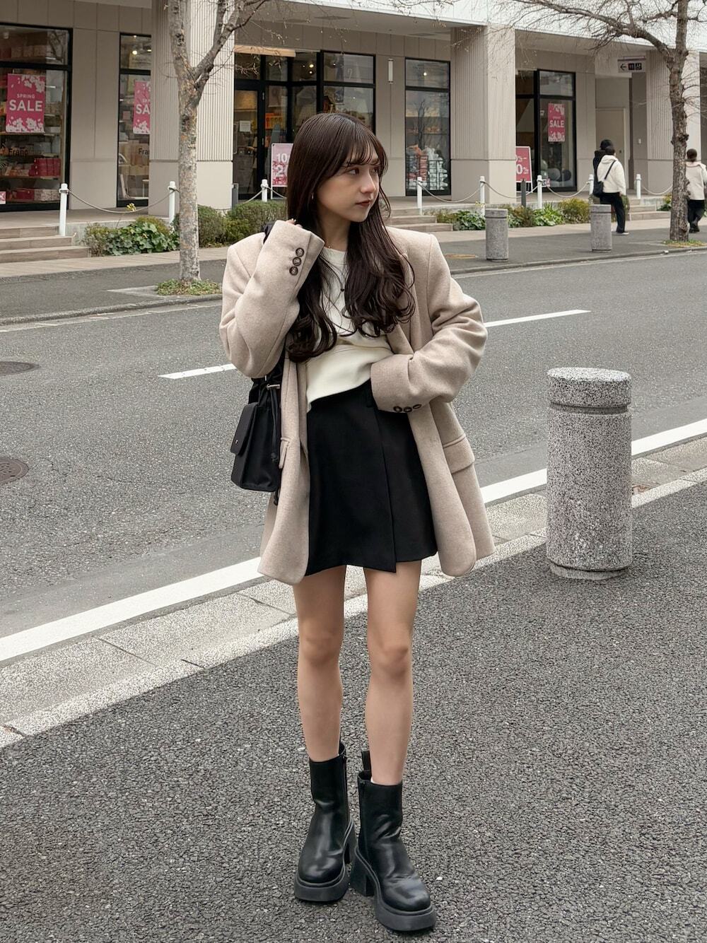 長度約落在臀下的西裝外套,向來是非常熱門的款式設計,不僅能遮住臀部肉肉,透過素色上衣 + 短裙,可以露出腿部線條,製造纖細修長比例,隨性加上長靴或短靴,連結輕甜可愛的女孩氣息。