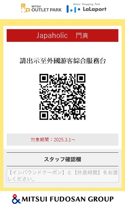 請至1樓統一免稅櫃檯旅客服務中心,出示以上優惠券QRcode,即可領取最高 10% 折扣優惠券資訊的「訪日旅客專用優惠券」, 以及能舒緩旅途疲勞的「休足時間貼布」。